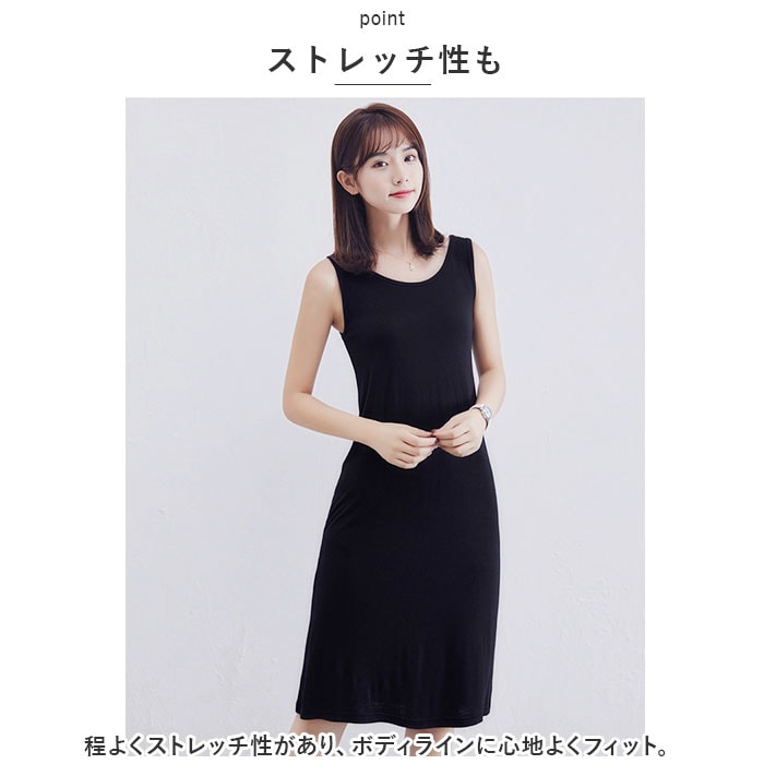 | 商品説明 | 着回し力ばっちり。タンクトップタイプのインナーワンピースが新登場。【夏にぴったりのタンクトップワンピース】サラッとした生地感&しっとり柔らかな肌触り。汗ばむ季節もムレにくく快適◎(※透け感のある素材です。)【ストレッチ性も】程よくストレッチ性があり、ボディラインに心地よくフィット。【シンプルなワンカラーデザイン】どんなアイテムとも合わせやすい、無地のワンカラータイプ。落ち着きのあるベーシックカラーをラインナップ。【クルーネックタイプ】華奢なアクセサリーも映える♪やや深めのクルーネック仕様。【お好みの丈感を選べる3タイプ】ショート・ロング・マキシの3タイプをご用意♪お好みの丈感をチョイスするも良し、丈違いで揃えてコーデに合わせて使い分けもOK。【使い方いろいろ】お手持ちのシャツなどと合わせて、カジュアルおしゃれにレイヤード!ルームウェアとしても活躍する1枚♪ |