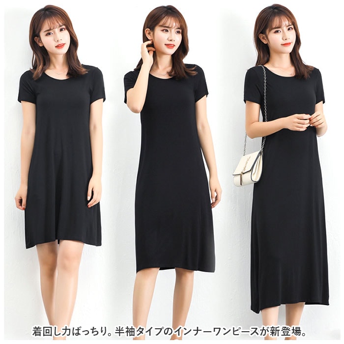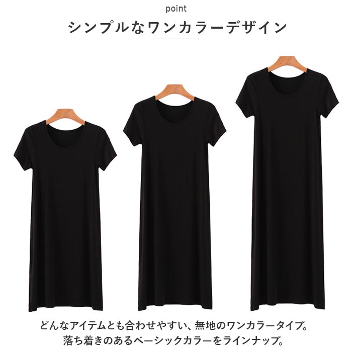 | 商品説明 | 着回し力ばっちり。半袖タイプのインナーワンピースが新登場。【夏にぴったりの半袖ワンピース】サラッとした生地感&しっとり柔らかな肌触り。汗ばむ季節もムレにくく快適◎(※透け感のある素材です。)【ストレッチ性も】程よくストレッチ性があり、ボディラインに心地よくフィット。【シンプルなワンカラーデザイン】どんなアイテムとも合わせやすい、無地のワンカラータイプ。落ち着きのあるベーシックカラーをラインナップ。【クルーネックタイプ】華奢なアクセサリーも映える♪やや深めのクルーネック仕様。【お好みの丈感を選べる3タイプ】ショート・マキシ・ロングの3タイプをご用意♪お好みの丈感をチョイスするも良し、丈違いで揃えてコーデに合わせて使い分けもOK。【使い方いろいろ】お手持ちのシャツなどと合わせて、カジュアルおしゃれにレイヤード!ルームウェアとしても活躍する1枚♪ |