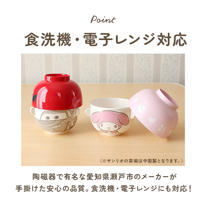 | 商品説明 | お子様も大人も夢中になる、人気キャラクター達の汁椀茶碗セットが登場♪【人気キャラクターの世界観】人気キャラクターの世界観が広がるデザインとカラーでお食事タイムがもっと楽しく♪【お子様も持ちやすい】小さめサイズでお子様も持ちやすい。さらに深めの設計なのでお茶碗にはおかずやスープを入れても★【品質と安心】陶磁器で有名な愛知県瀬戸市のメーカーが手掛けた安心の品質。食洗器・電子レンジにも対応しているのも嬉しいポイント。(※サンリオの茶碗は中国製となります。)【機能とデザインの融合】収納もスペースを取らず、お茶碗と汁椀、二つを重ねるとどんぐりのような形でとってもキュート♪【ギフトにも最適】お子様の成長を祝うギフトや、キャラクター好きの友人へのプレゼントにも最適。 |