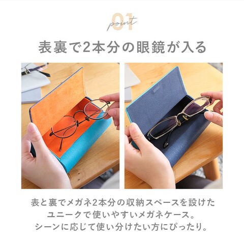| 商品説明 | 【2本のメガネをスマートに収納!】シーンに合わせてメガネを掛け替える方に!鮮やかなコントラストが目を惹く「2in1メガネケース」【メガネ2本が手のひらにすっぽり】滑らかな曲線フォルムの表と裏に、メガネ2本分の収納スペースを設けたユニークなメガネケース。【サッと開くマグネットフラップ】親指を軽く添えるだけのワンタッチ開閉!メガネがサッと出し入れできるマグネットフラップ採用。【自由な組み合わせで持ち歩ける!】近視用メガネとPCグラス、サングラスとシニアグラスなど、自由な組み合わせで収納が可能!【しっかり保護するハードタイプ】丈夫で凹みにくいアルミ素材のフレームがメガネをしっかり守る、ハードタイプケースを採用。【内側は滑らか起毛素材】ケース内側はメガネのレンズやフレームを細かなキズから守る!指触り滑らかな起毛素材仕上げ。【パッと目を惹くリバーシブルカラー】ケース表面は流れるような水シボを刻んだレザー調素材。表裏で色の異なるバイカラーがオシャレ。【敬老の日のギフトにも】内貼り素材もネイビーとオレンジで色を切り替えてあり、メガネの取違えの心配のない安心設計。 |
