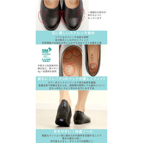 | 商品説明 | 足に優しいストレッチ設計の軽量オフィスパンプスです。スリーポイントが足裏に優しくフィットして、足裏の負担を軽減します。お仕事ではもちもん、普段やフォーマルシーンにもお使いいただけます。 |