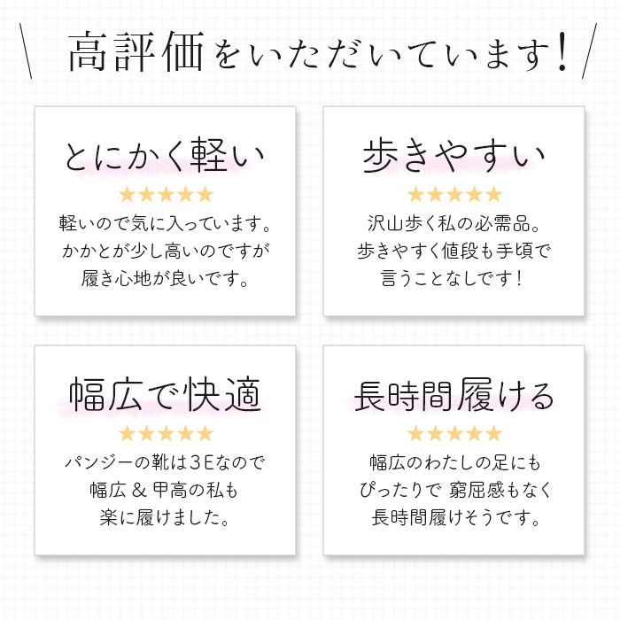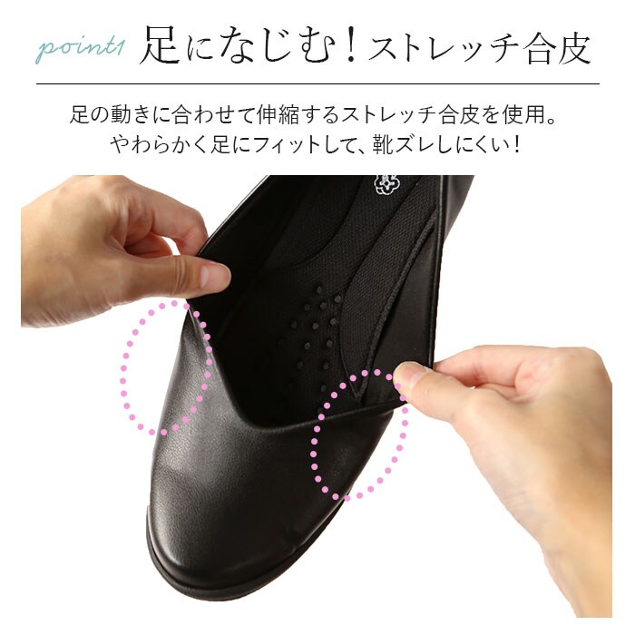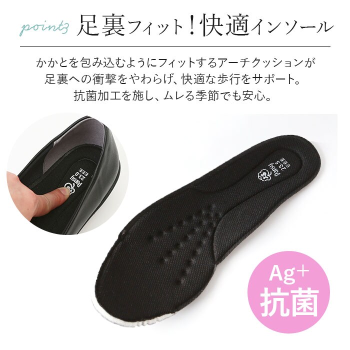 | 商品説明 | 軽くて歩きやすさが魅力的なブランド「Pansy(パンジー)」から、Vカットが足元をシャープに演出してくれるオフィスパンプスが登場。パンジー独自のストレッチ合皮を使用した快適パンプス。日中歩き回る日でも疲れにくく軽やかな足元で過ごせます。アッパーのVカットデザインが足元をシャープに見せ、さらに4.5cmヒールで美脚効果も。楽チンだけど綺麗な足元に◎インソールはかかとを包み込むようにフィットするU字型アーチクッション。足裏への衝撃を緩和し、さらに嬉しい抗菌加工済み。軽量、クッション性に優れたEVA素材のアウトソール。前後2カ所にあるゴム素材がグリップ力を高め、安定感のある歩行を実現。安心の日本製。 |