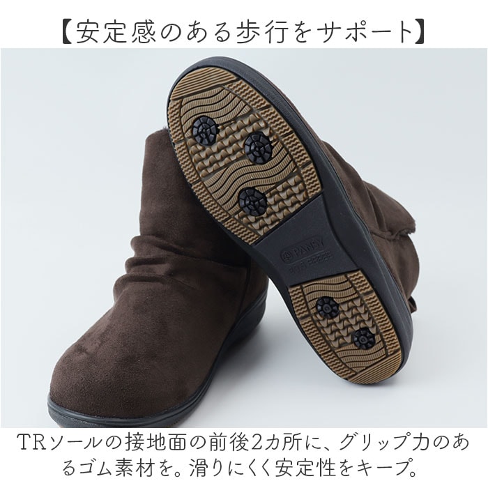 | 商品説明 | 【ラクにお出かけできる冬の相棒】シンプルなデザインと、抜群の機能性◎足元あったか「pansy ショートブーツ」。【温かみのある秋冬コーデにマッチ】表面はシックなスエード調。履き口から覗くボア調の起毛素材がアクセント。【水濡れも気にしない生活防水仕様】通常のシューズに比べて内部に水が侵入しにくく、お天気が不安定な日も安心。お手入れも楽々。(※1)甲表素材に撥水加工済み。完全防水ではありません。甲上部まで水に浸かる場合や、長時間の雨中での使用においては、内部に水が侵入する可能性があります。【いつでもどこでも足入れスムーズ】サイドゴムを忍ばせ、履き口が大きく開いて脱ぎ履きに手間取らない◎脱げにくくフィット!【ふんわりあったか♪優しい肌触り】内側は全面、足元を柔らかく包み込む起毛ニット仕上げ。肌触りが良く、快適な履き心地◎【優れた断熱性であたたかさをキープ】高発泡ポリエチレンシート「ミラマット(R)」を使用。地面からの冷気を遮断し暖かさを保つ◎(※2)断熱性を発揮する高発泡ポリエチレンシート「ミラマット(R)」をインソールの下面に使用しております。【効果が持続する抗菌防臭加工】インソールは安全かつ長時間効果のある抗菌防臭加工済み。いつも清潔なまま履けるのが嬉しい!【締め付けのない幅広5Eタイプ】ゆったりとした5E仕様。幅広で靴が窮屈に感じる方におすすめ。【ふわっと軽快でストレスフリー】足に負担のかかりにくい軽やか設計。アクティブに動けて、長時間の移動も安心。【屈曲性があり歩きやすさが向上】つま先部分は、足の動きに合わせて柔軟に曲がる形状。蹴り上げやすくつまずきにくい!【安定感のある歩行をサポート】TRソールの接地面の前後2カ所に、グリップ力のあるゴム素材を。滑りにくく安定性をキープ。【お気に入りを選べるカラー】コーデに合わせやすい、ベーシックカラーをラインナップ。ヘビロテ間違いなし☆ |