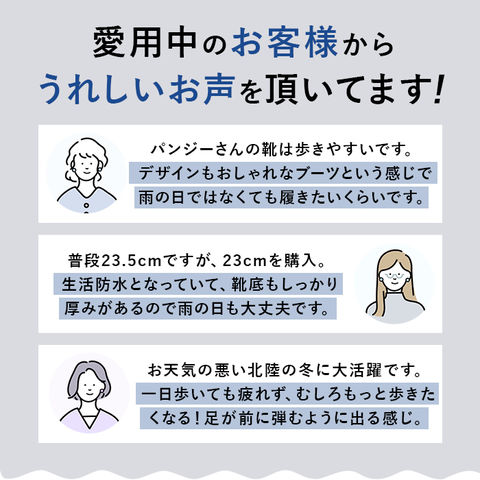 | 商品説明 | 突然の雨も怖くない!生活防水設計で気軽に履ける「パンジー サイドゴアレインブーツ」アッパーとソールを隙間なく接着した、PUダイレクトソーリング製法を採用。靴の中に水が浸入しにくく、天気を気にせずにおしゃれを楽しめる♪(※完全防水ではありません。)足を包み込むようにふんわりフィットする、クッション性に優れたウレタンインソールで歩きやすさもばっちり。アウトソール接地面の前後2カ所に、グリップ力に優れたゴム素材を使用。歩きやすいのはもちろん、長時間のお出かけにもおすすめ。長期間効果が持続する抗菌防臭加工が施されているので、ブーツを脱ぐ時も安心。伸縮性に優れ、履き口がサッと広がる幅広サイドゴアで脱ぎ履きがスムーズ。踵部分には、指で引っぱりながら足入れできるプルストラップ付き。足首が細く見える様に計算されたカジュアルなデザイン。厚底でスタイルアップ効果にも期待♪ |