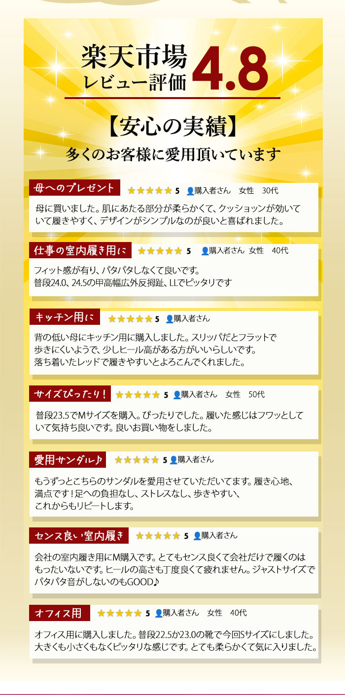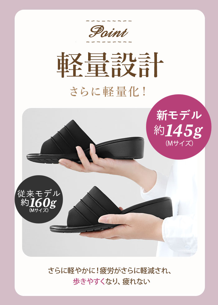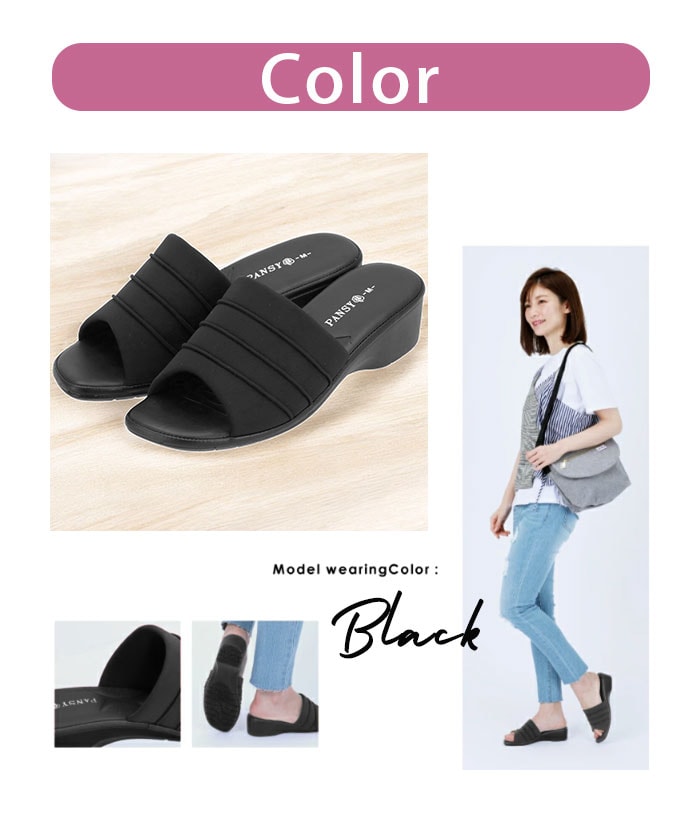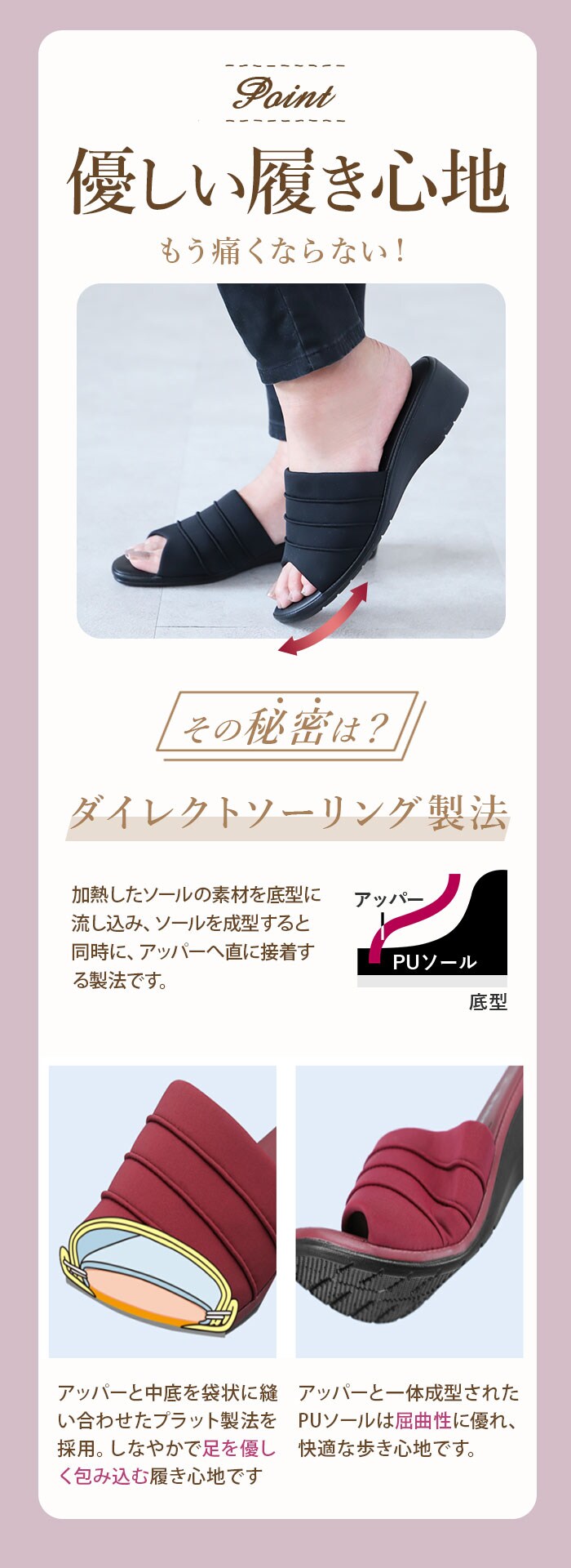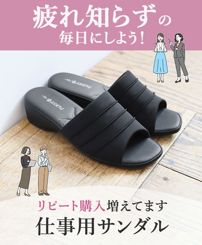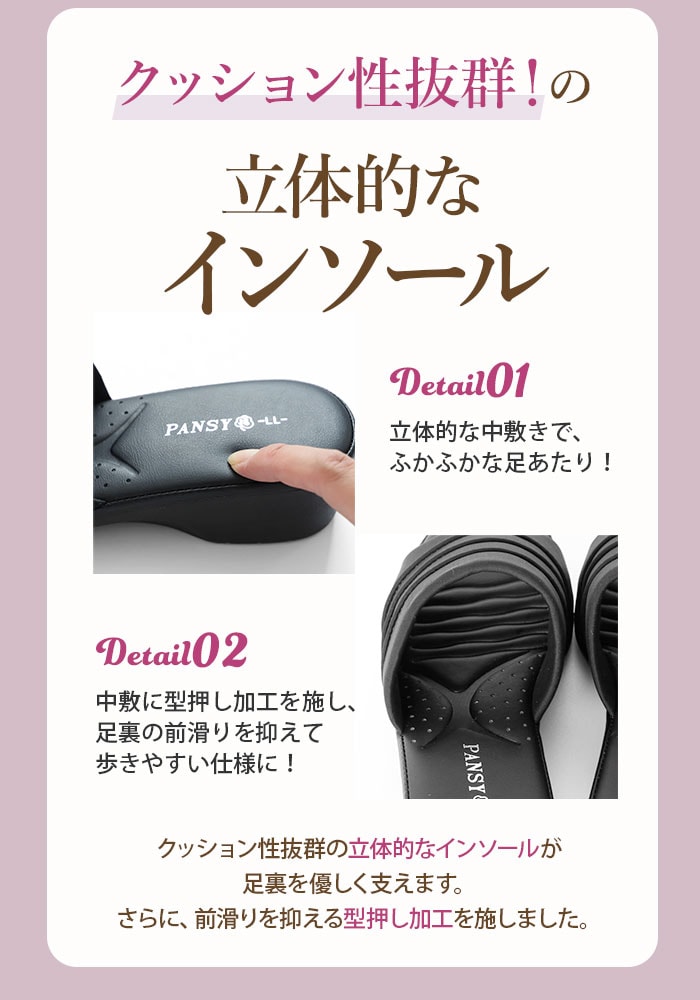 | 商品説明 | ふわっときもちいい♪人気のサンダルがより軽く快適に!Pansy(パンジー)のカジュアルサンダル。ダイレクトソーリング製法で、クッション性&屈曲性に優れ、歩きやすいソールに!『ダイレクトソーリング製法』とは…加熱したソールの素材を底型に流し込み、ソールを成型すると同時に、アッパーへ直に接着する製法。従来モデル約160g→新モデル約145gと、もっと軽やかに!(※Mサイズの片足の重さ)甲部分に、伸縮性に優れたソフトなストレッチ素材を使用。足を入れると、足の一番幅広の部分が伸びる設計で、足の形状にフィット。締め付け感が少ないので、長時間の着用も快適に。甲部分と中底を一緒に縫い合わせて袋状に仕上げ、表底を取り付けるプラット製法を採用。足を包み込むような優しい履き心地。立体的な中敷きで、ふかふかな足あたり。中敷に型押し加工を施し、足裏の前滑りを抑えて歩きやすい仕様に。普段使いはもちろん、オフィスでの履き替え用など、お仕事履きとしてもオススメ。 |