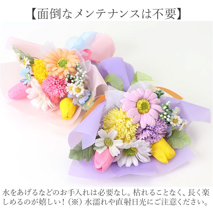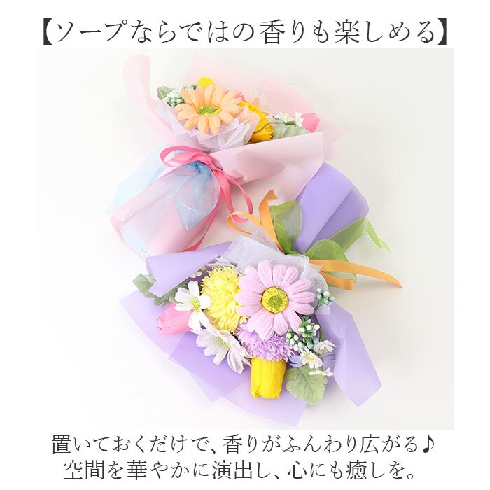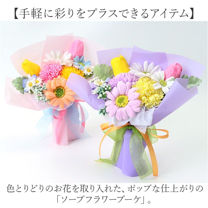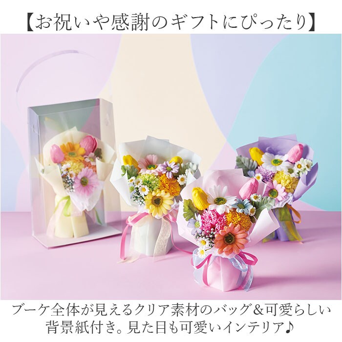 | 商品説明 | 【手軽に彩りをプラスできるアイテム】色とりどりのお花を取り入れた、ポップな仕上がりの「ソープフラワーブーケ」。【生花のようなソープフラワー】造花と石鹸素材から作られた、観賞用フラワーアレンジメント。生花さながらの美しい色合い♪【面倒なメンテナンスは不要】水をあげるなどのお手入れは必要なし。枯れることなく、長く楽しめるのが嬉しい!(※)水濡れや直射日光にご注意ください。【ソープならではの香りも楽しめる】置いておくだけで、香りがふんわり広がる♪空間を華やかに演出し、心にも癒しを。【お祝いや感謝のギフトにぴったり】ブーケ全体が見えるクリア素材のバッグ&可愛らしい背景紙付き。見た目も可愛いインテリア♪(※)バッグなどはご自身で組み立ててください。ブーケ単体で自立させることも可能です。 |