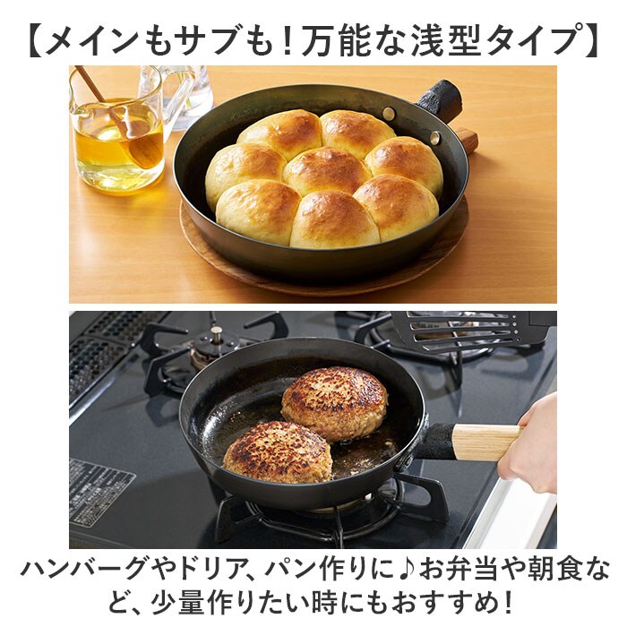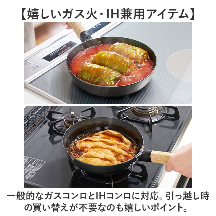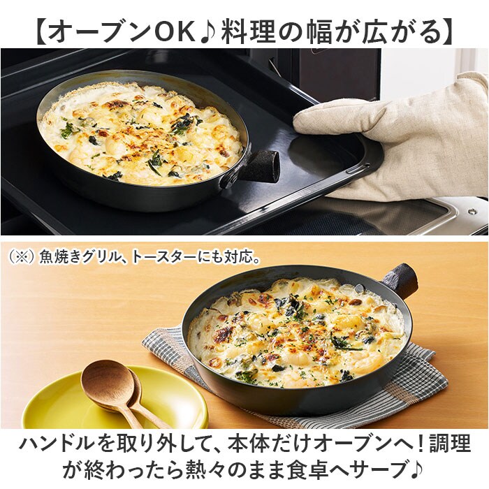 | 商品説明 | 【毎日の料理を楽しく、美味しく♪】キッチン空間にマッチ!「like-it オーブンでも使える鉄フライパン20cm 浅」。【丁寧に育てていける鉄フライパン】熱伝導性と蓄熱性に優れ、食材の旨みを引き出す!使うほどに油が馴染んで使いやすさも向上。【メインもサブも!万能な浅型タイプ】ハンバーグやドリア、パン作りに♪お弁当や朝食など、少量作りたい時にもおすすめ!【包丁のように握れるハンドル】ナチュラルな天然木素材&握りやすい楕円形。重たい鉄フライパンも扱いやすくデイリーに活躍◎【オーブンOK♪料理の幅が広がる】ハンドルを取り外して、本体だけオーブンへ!調理が終わったら熱々のまま食卓へサーブ♪(※)魚焼きグリル、トースターにも対応。【お手入れも簡単ハードテンパー加工】使い始めでも油馴染が良く、焦げ付きやサビが発生しにくい焼入れ加工済み。【嬉しいガス火・IH兼用アイテム】一般的なガスコンロとIHコンロに対応。引っ越し時の買い替えが不要なのも嬉しいポイント。【収納も無駄なく省スペース】ハンドルは、吊り下げ収納できるフック付き。取り外せば、戸棚やシンク下にすっきりIN。 |