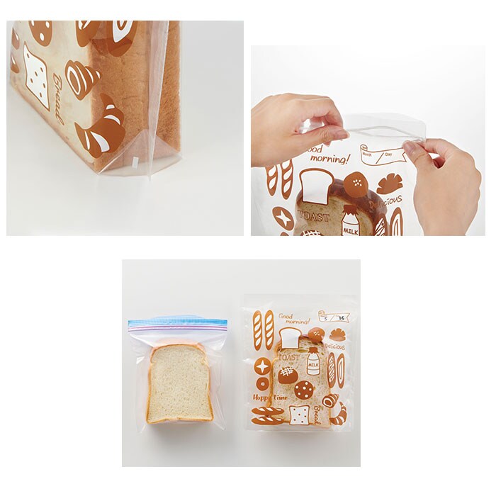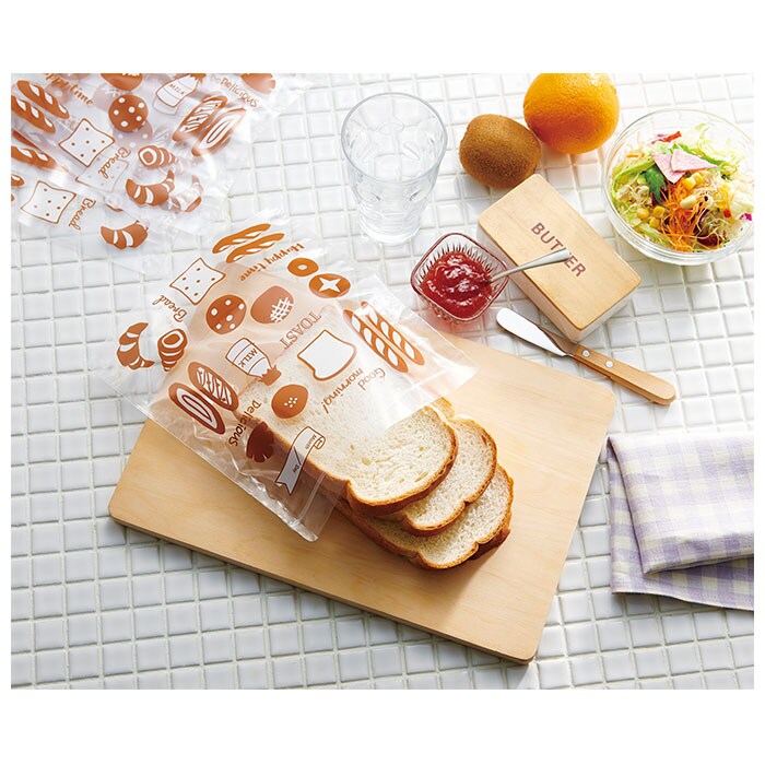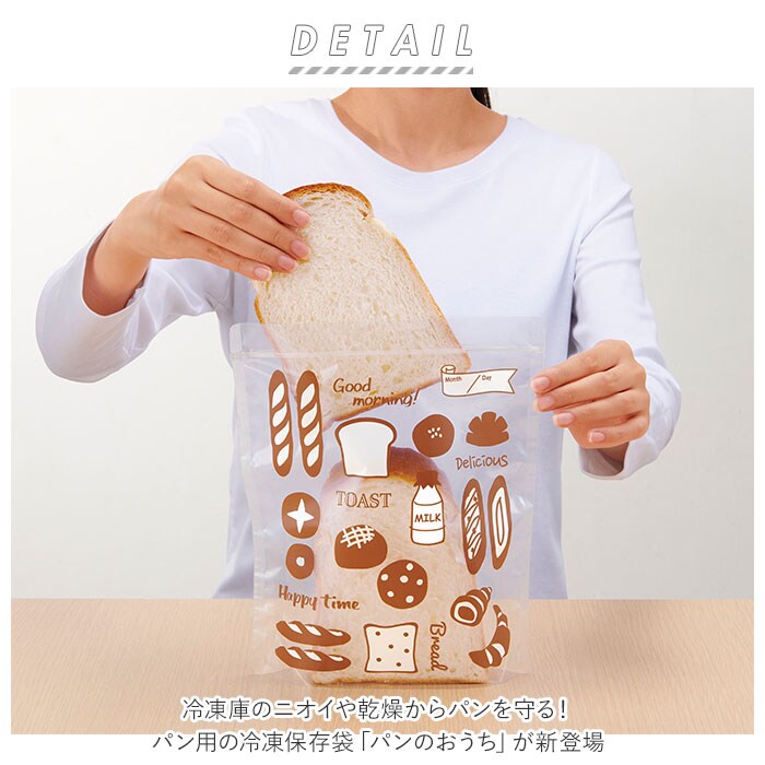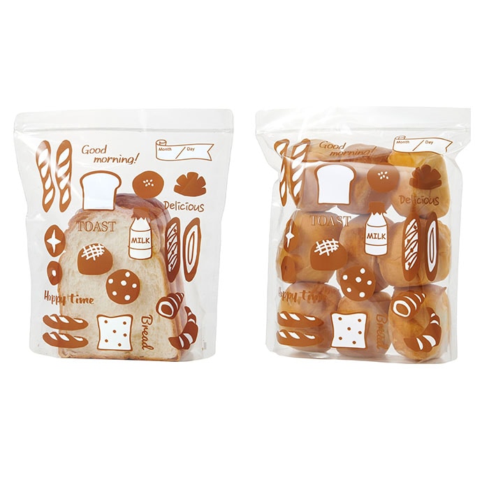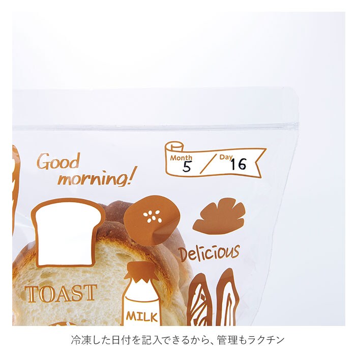 | 商品説明 | 冷凍庫のニオイや乾燥からパンを守る!パン用の冷凍保存袋「パンのおうち」が新登場。(1袋4枚組)マチ付きで4枚切りの食パン×2枚、5枚・6枚切りの食パン×3枚を保存可能。36個入りの大容量パンは4枚に分けてぴったり収まり、小分け保存に便利。(※パンの種類によっては入らない場合があります。)水蒸気と酸素に対するバリア性を高めた高機能フィルム「ハイバリアタイプフィルム」を採用!ジップ式で密閉できるから、お気に入りのパンを美味しく冷凍保存できちゃう!洗って繰り返し使えてエコ♪冷凍した日付を記入できるから、管理もラクチン。パンの絵柄が可愛い保存袋。ちょっとしたおすそわけにも便利。 |