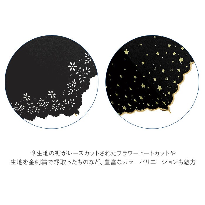 | 商品説明 | 紫外線から肌を守りたい女性の強い味方!完全遮光Parasol(パラソル)晴雨兼用ジャンプ傘。親骨50cmタイプ。親骨には軽くて丈夫なグラスファイバー骨を使用。しなやかな弾力性で強い風の日でも安心。傘生地の内側にはブラックコーティングを施し、紫外線はもちろん、地面からの照り返しも吸収し、赤外線や可視光線もカット!遮光率100%の生地を使用し、高い遮熱効果を実現。傘を差さずにいるときに比べ、熱をおよそ30%遮断するので、日傘の下は木陰のような涼しさ。親骨50cmの軽量コンパクトサイズで、傘生地がスムーズに開閉できる手開きタイプ。持ち手は高級感のあるレザー調ハンドルと、ナチュラルな雰囲気の木製ハンドルタイプの2種類をラインナップ。傘生地にははっ水加工を施し、日傘としてだけでなく、雨傘としても使用可能な晴雨兼用傘。突然の通り雨でも慌てずに対応できる♪傘生地の裾がレースカットされたフラワーヒートカット(910019フラワーシリーズ)や、生地を金の刺繍で縁取ったブラックベーシック(910020ブラックドットブラックボーダー)など、シンプルでエレガントなカラーバリエーションも魅力。紫外線遮蔽率99%以上UPF50+。※UPFとは…紫外線先進国であるオーストラリアやアメリカ等で使われている紫外線防止指数。UPF値が高いほど紫外線防止効果が高く、最高値は50+です。 |