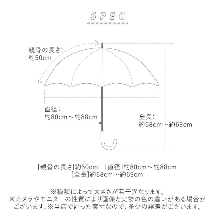 | サイズ | [親骨の長さ]約50cm [直径]約88cm [全長]約68cm ※サイズは当店平置き実寸サイズです。実際の商品とは多少の誤差が生じる場合がございます。あらかじめご了承ください。 |