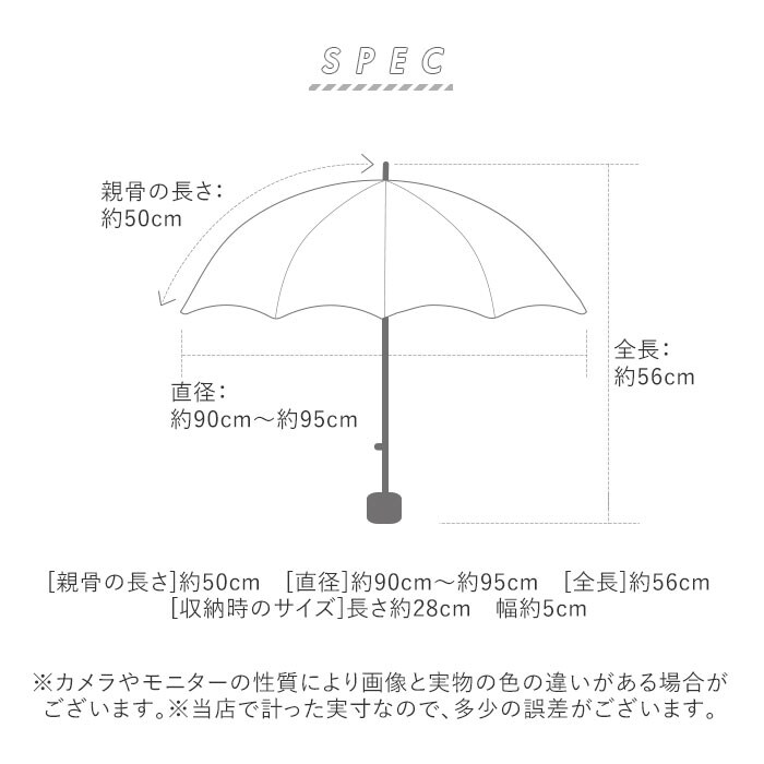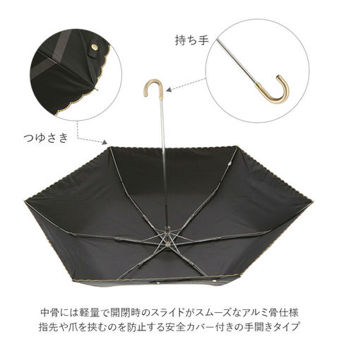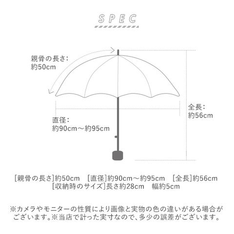 | 注意点 | この製品は紫外線遮蔽・遮光・遮熱効果を目的とした日傘です。生地にはPUコーティングを施しており、はっ水効果もあるため雨の日にもご使用いただけます。遮蔽率や遮光率等の数値は、製品ではなく生地に対しての検査結果であり、製品のデザインや実際の使用環境によって変わります。手元、または傘の先端がこわれたまま使用しないでください。骨の先端がこわれたまま使用しないでください。強風時や台風の時は破損する恐れがありますので、使用をお控えください。傘骨の構造部に手を触れないでください。ご使用後は水気を切って、陰干しして収納してください。色が移ることがあります。手元部材等が加水分解や経年劣化により破裂する原因になりますので車中などの高温多湿な環境に一定期間放置しないでください。降雨量が20mm以上の場合、ある程度使用されますと漏水の恐れがありますのでご注意ください。製品には構造上、骨同士が狭くなっている部分があり、骨に挟まれたり怪我をする恐れがありますので、手や指を入れないでください。製品には尖った部分があります。常に周囲の安全を十分にご確認の上使用してください。傘の開閉時及びシャフトの伸縮時には、顔や身体から離して使用してください。グラスファイバー骨部分が破損した際はトゲが刺さる場合がありますので、破損部分を直接触らないようにしてください。カメラやモニターの性質により、画像と実物の色の違いがある場合がございますのでご理解願います。 |