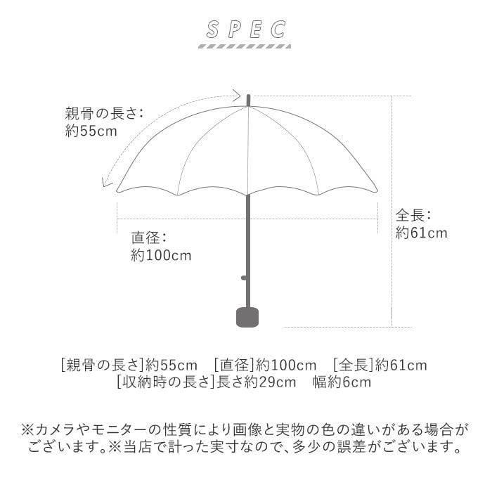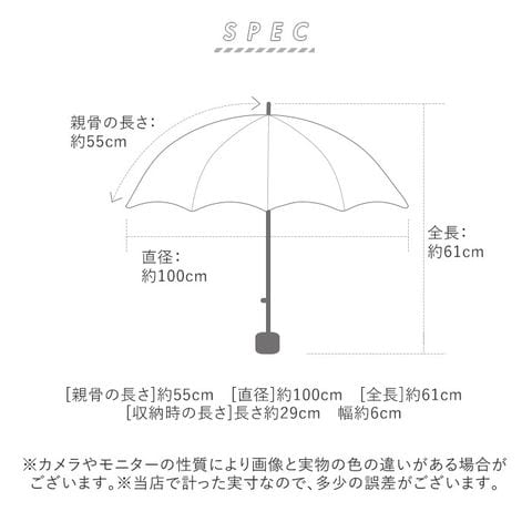 | サイズ | [親骨の長さ]約55cm [直径]約107cm [全長]約55cm [収納時のサイズ]長さ:約25cm 幅:約5.5cm ※サイズは当店平置き実寸サイズです。実際の商品とは多少の誤差が生じる場合がございます。あらかじめご了承ください。 |
