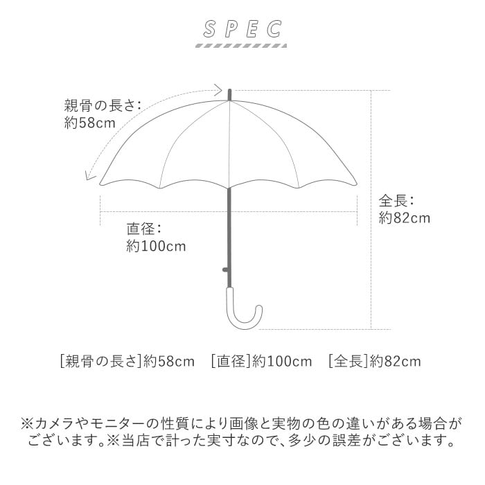 | サイズ | [親骨の長さ]約58cm [直径]約91cm [全長]約82cm ※サイズは当店平置き実寸サイズです。実際の商品とは多少の誤差が生じる場合がございます。あらかじめご了承ください。 |