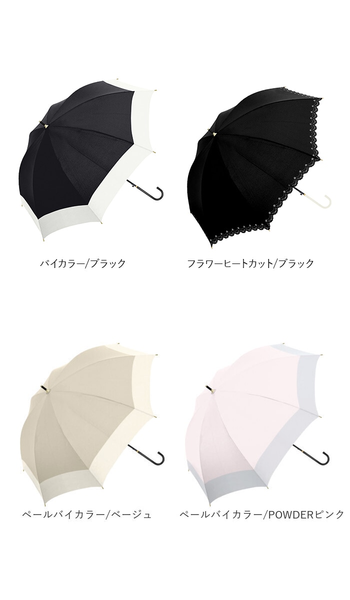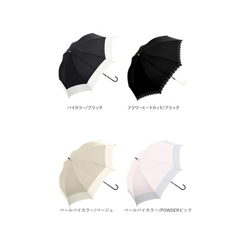 | 注意点 | この製品は紫外線遮蔽・遮光・遮熱効果を目的とした日傘です。生地にはPUコーティングを施しており、はっ水効果もあるため、雨の日にもご使用いただけます。遮蔽率や遮光率等の数値は、製品ではなく生地に対しての検査結果であり、製品のデザインや実際の使用環境によってことなります。手元、または傘の先端がこわれたまま使用しないでください。骨の先端がこわれたまま使用しないでください。強風時や台風の時は破損する恐れがありますので、使用をお控えください。傘骨の構造部に手を触れないでください。ご使用後は水気を切って、陰干しして収納してください。色が移ることがあります。手元部材等が加水分解や経年劣化により破裂する原因になりますので車中などの高温多湿な環境に一定期間放置しないでください。降雨量が20mm以上の場合、ある程度使用されますと漏水の恐れがありますのでご注意ください。製品には構造上、骨同士が狭くなっている部分があり、骨に挟まれたり怪我をする恐れがありますので、手や指を入れないでください。製品には尖った部分があります。常に周囲の安全を十分にご確認の上使用してください。傘の開閉時及びシャフトの伸縮時には、顔や身体から離して使用してください。グラスファイバー骨部分が破損した際はトゲが刺さる場合がありますので、破損部分を直接触らないようにしてください。カメラやモニターの性質により、画像と実物の色の違いがある場合がございますのでご理解願います。 |
