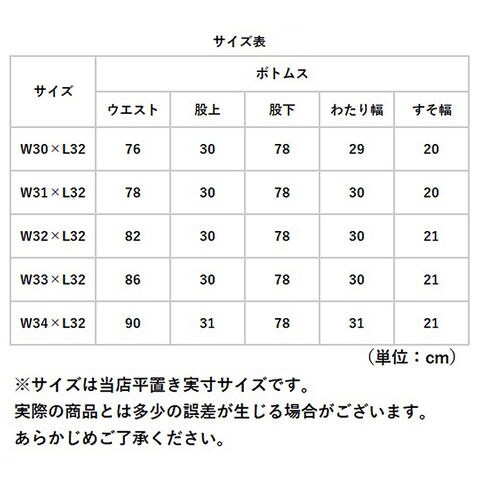 | サイズ | [メンズ] ・L32×W30 ・L32×W31 ・L32×W32 ・L32×W33 ・L32×W34 ※サイズについて詳細は、商品画像の中にあるサイズ表をご覧くださいませ。 |