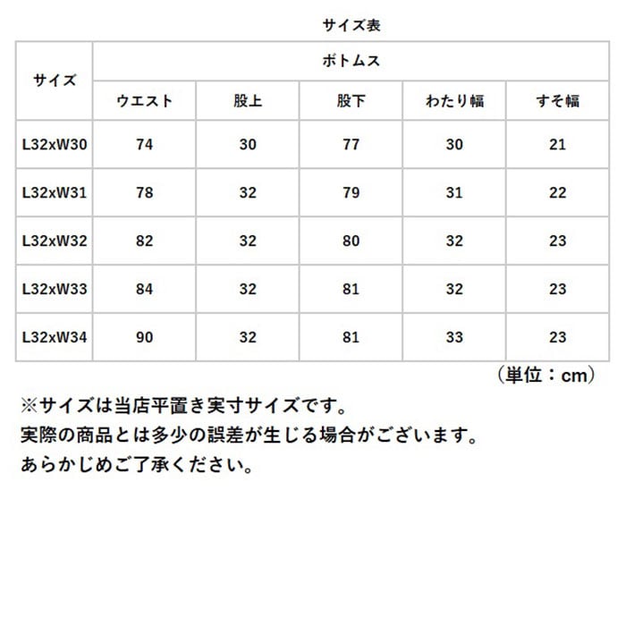 | サイズ | [メンズ] ・L32xW30 ・L32xW31 ・L32xW32 ・L32xW33 ・L32xW34 ※サイズについて詳細は、商品画像の中にあるサイズ表をご覧くださいませ。 |