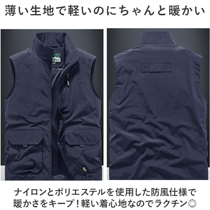 | 商品説明 | 安心の撥水加工!アウトドアやフィッシングなどにぴったりの高機能性◎防風ベストが登場。【屋外でも安心の撥水加工生地】雨水を弾く撥水加工を施した生地を使用。突然の雨でも安心。汚れに強いのも嬉しいポイント。※完全防水ではありません。【薄い生地で軽いのにちゃんと暖かい】ナイロンとポリエステルを使用した防風仕様で暖かさをキープ!軽い着心地なのでラクチン◎【ムレにくいメッシュ素材を使用】内側はメッシュ素材を使用しているので、ムレにくく1日中着てもストレスフリー☆【大きめポケットを5つ搭載!】スマホも入る大きめのポケットを搭載。フロントに3つ、内ポケットを2つと充実の機能面。【着ぶくれしにくいシルエット】着ぶくれしにくいすっきりシルエットなので、アウターの中に着込んでも◎ロングシーズンOK。【シーンを選ばないシンプルデザイン】無駄な装飾のないシンプルなデザインなので、普段使い、アウトドア、お仕事と幅広く使える! |