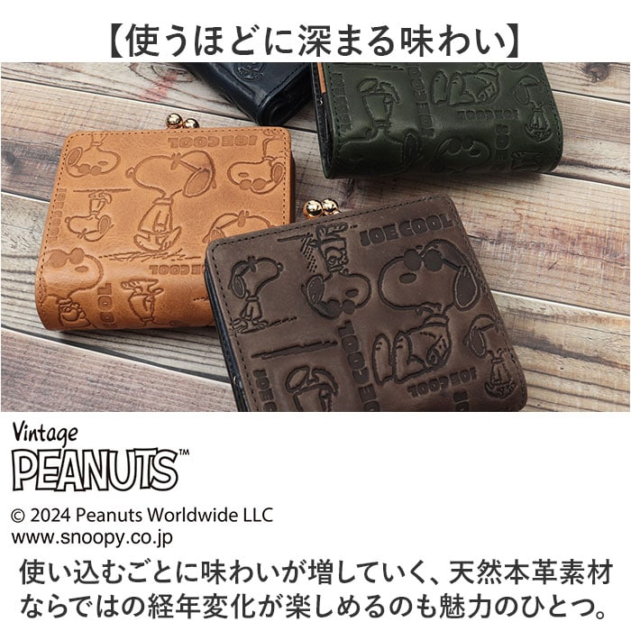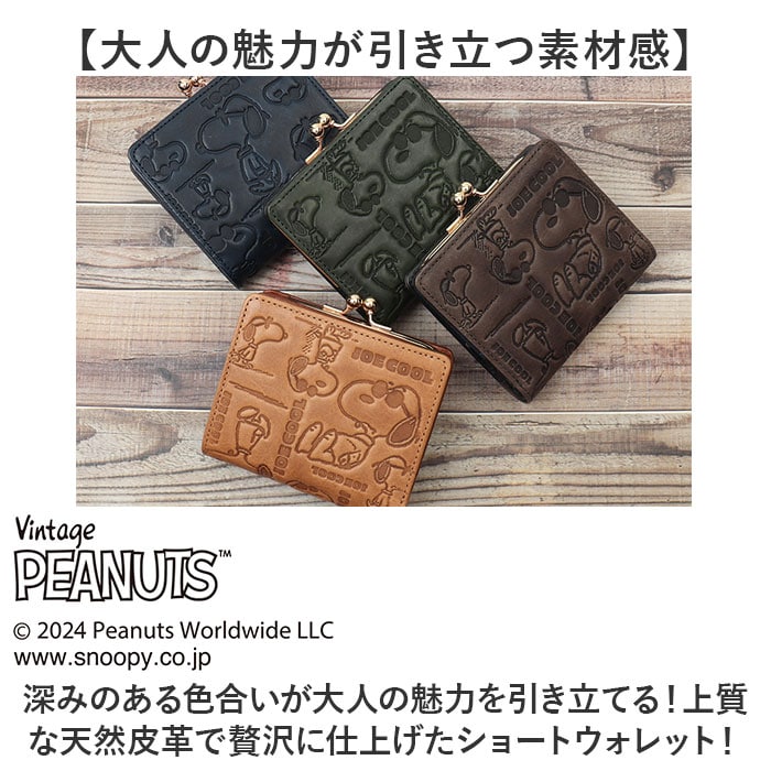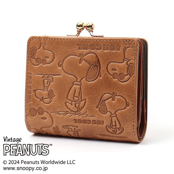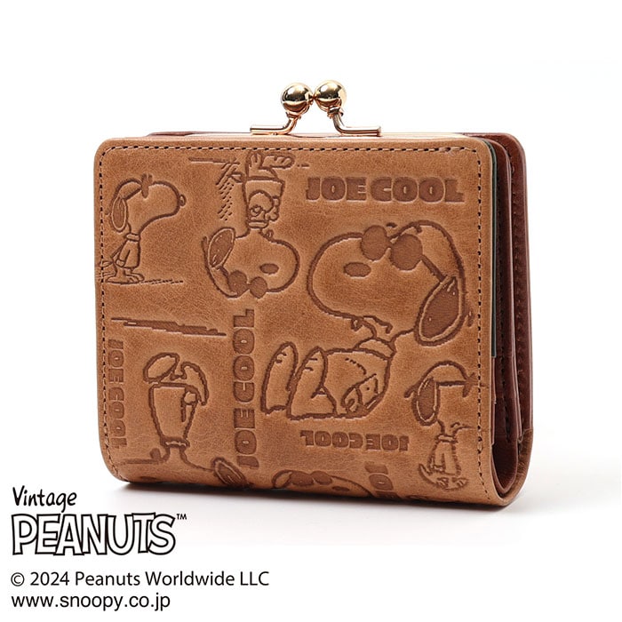 | 商品説明 | 【PEANUTSの世界観溢れるデザイン!】ふっくらハリのある本革の手触りが指先に馴染む「PEANUTS JOE COOL monogram 二つ折り財布」!【大人の魅力が引き立つ素材感】深みのある色合いが大人の魅力を引き立てる!上質な天然皮革で贅沢に仕上げたショートウォレット!【スナップボタンで簡単開閉】スナップボタンでパッと開くフラップの内側に、札入れとカードポケットを配置したシンプル構造。【キャッシュレス派にも嬉しいつくり】フラップを開いて正面に、厳選したカード類をピタッと収納できるカードポケットを6枚分配置。【紙幣の出し入れがスムーズ】札入れは紙幣がサッと取り出せる片側オープン構造。お札が滑り落ちないスリットガード付きで安心。【レトロ可愛いがま口スタイル】お会計時に手間取らない♪パカッと開く小銭入れは、コインがパッと見やすいボックスマチ仕上げ。【細部までこだわったマテリアル】鏡面のように煌めくゴールド色のがま口金具、内側にさりげなく刻印したVintage PEANUTSのロゴがアクセント。【使うほどに深まる味わい】使い込むごとに味わいが増していく、天然本革素材ならではの経年変化が楽しめるのも魅力のひとつ。【世界中で愛されるデザイン】世界中から愛されるPEANUTSアートを大人の革小物にアレンジ。サングラスを掛けてポーズを決める、SNOOPY扮する「JOE COOL」を型押しした遊び心溢れるデザイン。【ポケット仕様】・札入れスペース×1・カードポケット×6・コインポケット(ボックスマチ仕上げ)×1 |