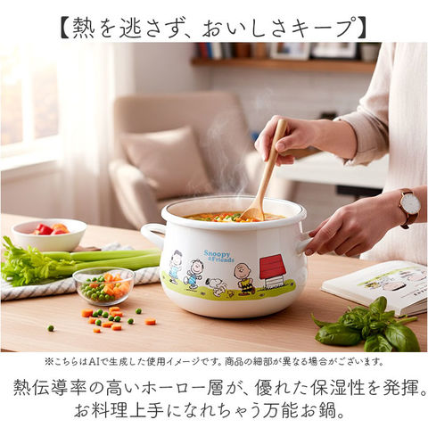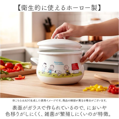商品説明【お料理タイムをおしゃれに彩る♪】煮込み料理やジャム、離乳食作りに「PEANUTS ホーロー両手鍋 16cm」が登場。【キュートなPEANUTSデザイン】かわいくて癒される、大人気のPEANUTSシリーズ。ぽってり両手持ちフォルムがたまらない!【衛生的に使えるホーロー製】表面がガラスで作られているので、においや色移りがしにくく、雑菌が繁殖しにくいのが特徴。【熱を逃さず、おいしさキープ】熱伝導率の高いホーロー層が、優れた保湿性を発揮。お料理上手になれちゃう万能お鍋。【手作りならではのナチュラルさ】ほとんどの工程を手作りで製造しているので、味わい深い風合いのある仕上がりに♪【食材の味をそのままに】表面はガラス製なので金属が溶出せず、食材そのものも味わいを守ってくれる。離乳食作りにも◎【キッチンに置くだけで映える♪】上品でいてナチュラルな雰囲気なので、そのまま置くだけでおしゃれに見せてくれる☆【ギフトにも喜ばれる♪】キャラクターや雑貨好きの方へプレゼントするのもオススメ。お料理好きに嬉しいアイテム。