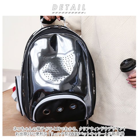 | 商品説明 | ネコちゃんの様子がひと目でわかる、クリアウィンドウデザイン!お出掛けに便利な「リュック型2WAYペットキャリー」が新登場。ネコの顔のシルエットが描かれたクリア窓がチャームポイント!外出中は内側からも外を眺めることができて、人見知りのネコちゃんもリラックス♪キャリーバッグ正面と両側面に設けた15個の大きな通気孔と左右2つのメッシュ窓で通気性をしっかりと確保。ネコのシルエット内側にも無数の通気孔を設け、蒸し暑さの気になる季節でも安心。リュック正面のファスナー窓からペットの出入りがスムーズ。左側面のメッシュ小窓のファスナーは、外出先でおやつをあげたり、ネコちゃんの頭を撫でで安心させてあげたいときに大活躍。バッグ内側には、リードとつなげるナスカン金具が付属しているので、ペットの急な飛び出しを防止!付属の中敷きマットは、肌触りの優しいふわふわ生地面とオールシーズン使えるフラット面、シーンに合わせて使い分けができるリバーシブルタイプ。バッグの右サイドには、お気に入りのおやつやペット用ウェットティッシュの収納に便利なメッシュポケット付き。チェストベルト付きのショルダーベルトでしっかり背負えるリュック型デザイン。背中に当たる部分とベルト裏面は快適なメッシュクッションで仕上げ、飼い主さんの身体への負担も優しく軽減。両肩に背負えるペットリュックとしてはもちろん、ミニハンドルで手持ちのペットキャリーにもできる2WAY仕様。中央のダブルファスナーを開放すれば、使わない時にはコンパクトに折りたたんで収納できるのも嬉しいポイント!ペットの様子がつぶさに見てとれるクリア窓付きペットキャリーで、動物病院に連れて行く時もとっても安心♪ |