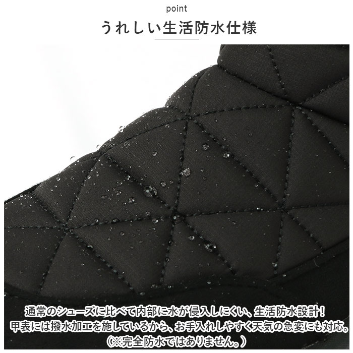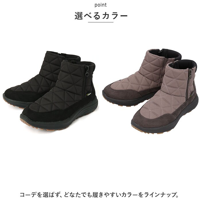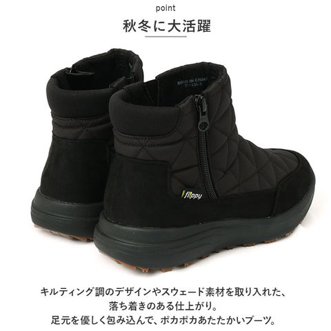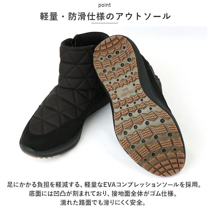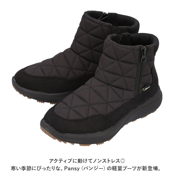 | 商品説明 | アクティブに動けてノンストレス◎寒い季節にぴったりな、Pansy(パンジー)の軽量ブーツが新登場。【秋冬に大活躍】キルティング調のデザインやスウェード素材を取り入れた、落ち着きのある仕上がり。足元を優しく包み込んで、ポカポカあたたかいブーツ。【うれしい生活防水仕様】通常のシューズに比べて内部に水が侵入しにくい、生活防水設計!甲表には撥水加工を施しているから、お手入れしやすく天気の急変にも対応。(※完全防水ではありません。)【あたたかさをキープ】インソール下にポリエチレンシート「ミラマット(R)」を使用。地面からの冷気をブロックし、靴内のあたたかい空気を逃さない!【いつも快適&清潔】程よくクッション性のあるインソールが、衝撃を吸収。抗菌防臭加工済みでいつも清潔。取り外しできるから、お手入れもラクラク。【足入れがスムーズ】履き口の内側サイドには、伸縮性のあるゴム素材を織り込み。外側はファスナー式で着脱も簡単。【歩きやすさが向上】つま先にかけて上を向いたトゥスプリング設計。つまづきにくく、蹴り上げやすい!【長時間履いても大丈夫】履き口の後ろは柔らか素材で靴ズレ防止にも♪【軽量・防滑仕様のアウトソール】足にかかる負担を軽減する、軽量なEVAコンプレッションソールを採用。底面には凹凸が刻まれており、接地面全体がゴム仕様。濡れた路面でも滑りにくく安全。【選べるカラー】コーデを選ばず、どなたでも履きやすいカラーをラインナップ。 |