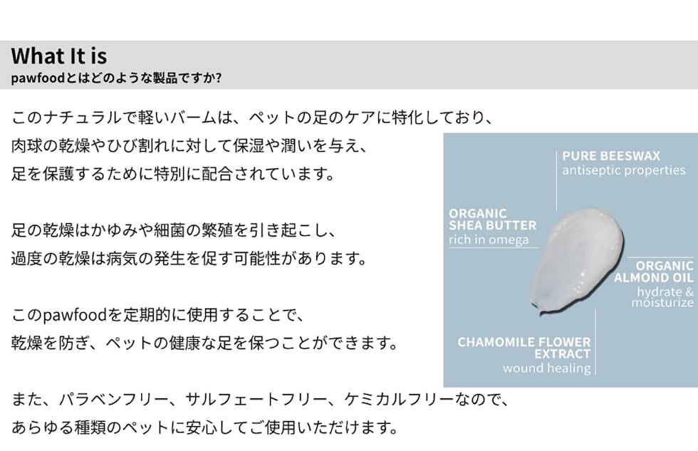 商品説明完全天然・ヴィーガン ペットケア製品完全天然・オーガニック ペットの足・鼻用ワックスpawfoodは、皆さまの大切なペットの鼻、足、肘に栄養を与え、保護します。防腐剤を一切使用していない高品質の天然成分で作られています。純度100%の蜜蝋、オーガニックココナッツオイル、オーガニックシアバター、オーガニックアーモンドオイル、カモミールエッセンシャルオイルを配合しています。舐めても安全です。