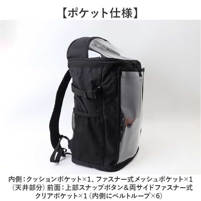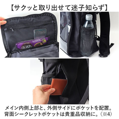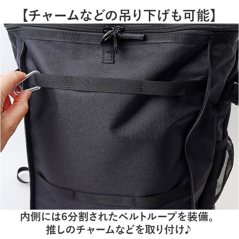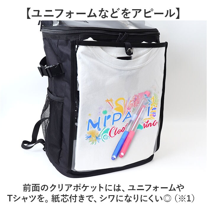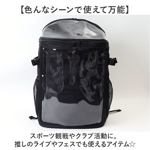 | 商品説明 | 【スポーツや推し活で大活躍☆】推しグッズなどを見せて収納♪遠征などにもおすすめの「推し活リュック」。【ユニフォームなどをアピール】前面のクリアポケットには、ユニフォームやTシャツを。紙芯付きで、シワになりにくい◎(※1)スナップボタン&両サイドファスナー式のポケットです。【チャームなどの吊り下げも可能】内側には6分割されたベルトループを装備。推しのチャームなどを取り付け♪【キャップやマスコットをIN】上部のクリアポケットは立体型。キャップやマスコットのフォルムを崩さず雨に濡れる心配もなし!(※2)ダブルファスナー式ポケットです。【ガバっと開いて出し入れスムーズ】メインルームは、左右どちらからも開くダブルファスナー式。取り出しやすいボックス型。【B4対応でノートPCも持ち運び】B4がすっぽり、マチもたっぷりで頼れる収納力!ノートPCやタブレットが入るポケット付き。(※3)クッションポケットの横幅は、A4がすっぽり収まるサイズ感です。上部はポケットから飛び出します。【サクッと取り出せて迷子知らず】メイン内側上部と、外側サイドにポケットを配置。背面シークレットポケットは貴重品収納に。(※4)ポケットの他、ショルダー部分にDカン付きです。【使い方自在なバックルベルト】カラビナやラバーバンドを取り付け。メッシュポケットに入れた収納物のホールドにも!【負担をかけず背負い心地快適】背面とショルダーベルトに、クッションをプラス。ムレにくいメッシュ仕様。【アクティブに動くシーンでも安心】ズリ落ちを防ぐチェストベルト。ワンタッチで装着でき、位置は調整可能。【色んなシーンで使えて万能】スポーツ観戦やクラブ活動に。推しのライブやフェスでも使えるアイテム☆【ポケット仕様】内側:クッションポケット×1、ファスナー式メッシュポケット×1(天井部分)前面:上部スナップボタン&両サイドファスナー式クリアポケット×1(内側にベルトループ×6)上部:ダブルファスナー式クリアポケット×1サイド:メッシュポケット×2背面:シークレットポケット×1 |