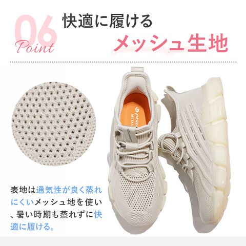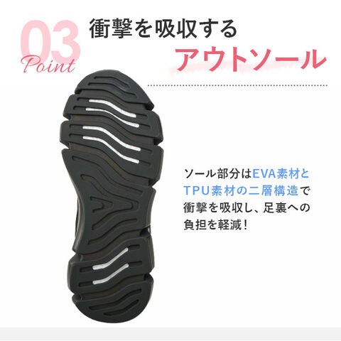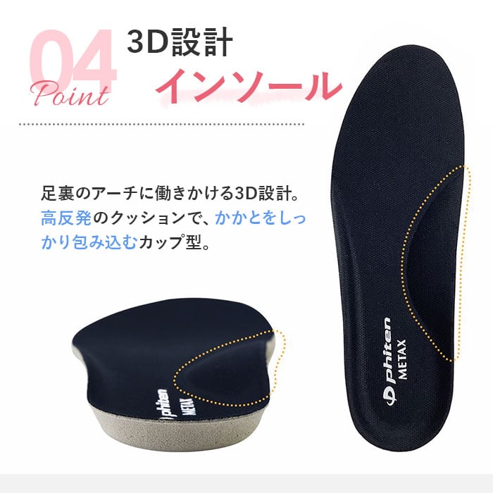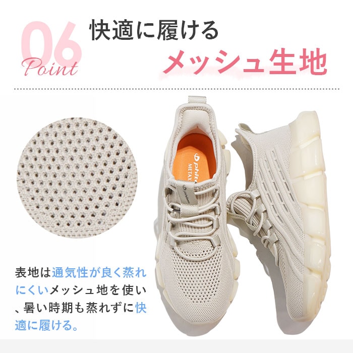 | 商品説明 | 【METAX搭載でストレス軽減】一日中歩いても疲れない♪METAX技術を採用したレディーススニーカー(PHL-003)【METAX技術】ファイテン社技術の水溶化メタル技術(METAX)を融合して開発されたスニーカー。【リラックス状態へと導く】インソールはMETAX布地を採用し、体をリラックス状態へとサポートしてくれる。【衝撃を吸収するソール】ソール部分はTPU素材で衝撃を吸収し足裏への負担を軽減。【蹴り出しをアシスト】さらにTPU素材特有の反発力で心地良い蹴り出しをアシストしてくれる♪【長時間履いても疲れにくい】かかとを優しくホールドするロングカウンター構造で歩行の安定感が増し、疲れにくい。【夏でも快適に履けるメッシュ地】表地は通気性が良く蒸れにくいメッシュ地を使い、暑い時期も蒸れずに快適に履ける。【着脱スムーズな履き口】履き口は開いたままキープされているので、手を使わずに着脱ができるのも嬉しいポイント。【結ばないシューレース】結ばずにほどけないシューレースをアッパーに配置。手間なく自然に自分サイズにフィット。【靴擦れを防ぐ】靴の柔らかい素材と、かかと部分はクッションを内蔵し靴擦れを防ぐ優しい履き心地に。【シンプルで使いやすい】コーデを選ばないワンカラー仕様。アッパーのブランドロゴとサイドラインがアクセント◎ |