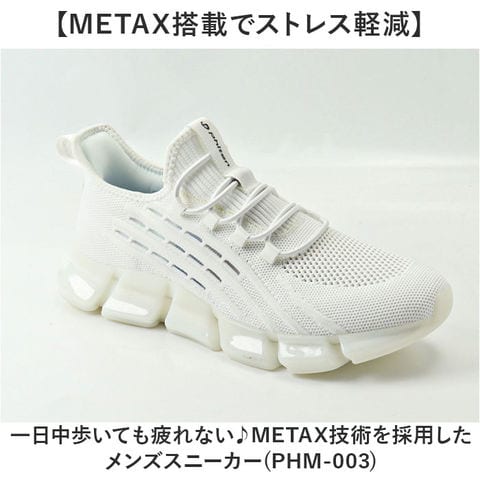 | 商品説明 | 【METAX搭載でストレス軽減】一日中歩いても疲れない♪METAX技術を採用したメンズスニーカー(PHM-003)【METAX技術】ファイテン社技術の水溶化メタル技術(METAX)を融合して開発されたスニーカー。【リラックス状態へと導く】インソールはMETAX布地を採用し、体をリラックス状態へとサポートしてくれる。【衝撃を吸収するソール】ソール部分はTPU素材で衝撃を吸収し足裏への負担を軽減。【蹴り出しをアシスト】さらにTPU素材特有の反発力で心地良い蹴り出しをアシストしてくれる♪【長時間履いても疲れにくい】かかとを優しくホールドするロングカウンター構造で歩行の安定感が増し、疲れにくい。【夏でも快適に履けるメッシュ地】表地は通気性が良く蒸れにくいメッシュ地を使い、暑い時期も蒸れずに快適に履ける。【着脱スムーズな履き口】履き口は開いたままキープされているので、手を使わずに着脱ができるのも嬉しいポイント。【結ばないシューレース】結ばずにほどけないシューレースをアッパーに配置。手間なく自然に自分サイズにフィット。【靴擦れを防ぐ】靴の柔らかい素材と、かかと部分はクッションを内蔵し靴擦れを防ぐ優しい履き心地に。【シンプルで使いやすい】コーデを選ばないワンカラー仕様。アッパーのブランドロゴとサイドラインがアクセント◎ |