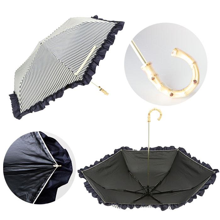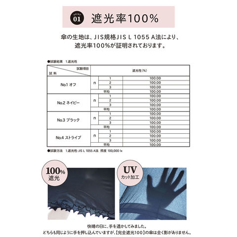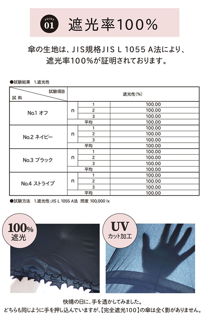 | 注意点 | 使用されている生地がJIS規格JIS L 1055 A法により遮光率100%のものを"100%完全遮光"としております。(フリル・縫製・加工部分はその限りではありません。体感温度はご使用環境や個人差により異なります。)裏地加工への強い摩擦や衝撃は剥離につながる恐れがあります。開閉やスライドの際は軽くさばいてからゆっくりと斜め下向きに丁寧にお取り扱いください。(上向きや急速な開閉は接続部に負荷がかかり、早期破損の可能性が高くなります。)閉じた際は、都度紐でまとめてください。開閉の際、やや固い感じやたたみ難さがありますが、生地の特性としてご理解ください。傘には耐久性として若干のあそび部分を持たせています。グラつきと勘違いされることがありますが、これにより破損や伸縮不能を回避します。製品には尖った部分があります。傘の開閉時には顔や身体から離して周囲の安全を十分に確認の上ご使用ください。手元、骨の先端が壊れたまま使用しないでください。強風時は危険ですので使用しないで下さい。ご使用後は陰干しして十分に乾燥させてから次回お使いください。(ご使用後、濡れたまま放置すると防水はっ水力の低下や骨の劣化につながります。)直射日光・高温多湿での保管や放置は退色する場合がありますので避けてください。カメラやモニターの性質により、画像と実物の色の違いがある場合がございますのでご理解願います。 |