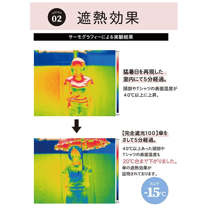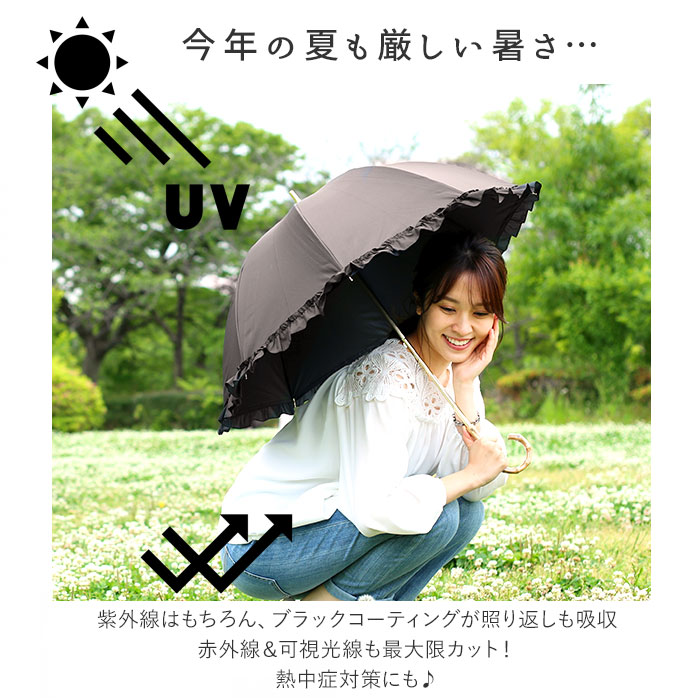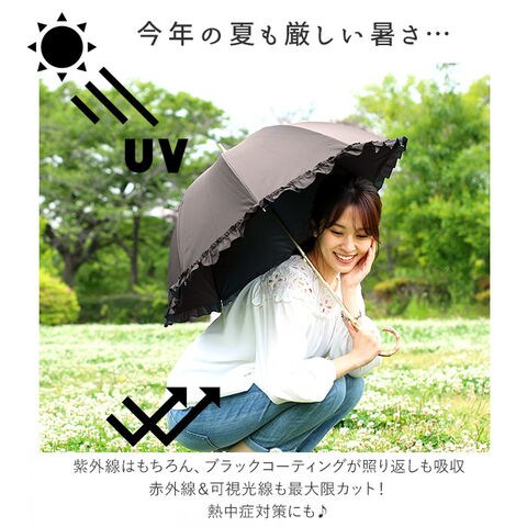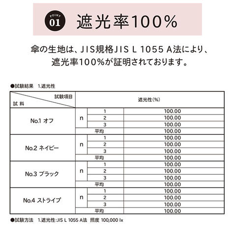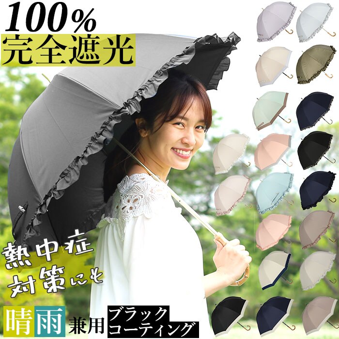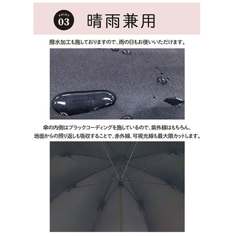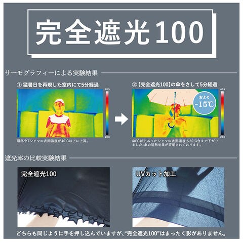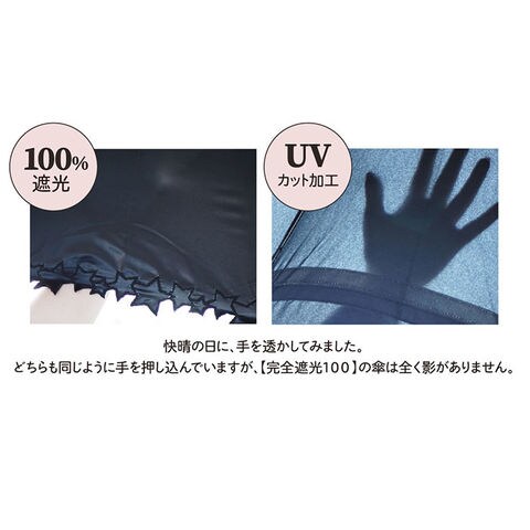 | 注意点 | 使用されている生地がJIS規格JIS L 1055 A法により遮光率100%のものを"100%完全遮光"としております。(フリル・縫製・加工部分はその限りではありません。体感温度はご使用環境や個人差により異なります。)裏地加工への強い摩擦や衝撃は剥離につながる恐れがあります。開閉やスライドの際は軽くさばいてからゆっくりと斜め下向きに丁寧にお取り扱いください。(上向きや急速な開閉は接続部に負荷がかかり、早期破損の可能性が高くなります。)閉じた際は、都度紐でまとめてください。開閉の際、やや固い感じやたたみ難さがありますが、生地の特性としてご理解ください。傘には耐久性として若干のあそび部分を持たせています。グラつきと勘違いされることがありますが、これにより破損や伸縮不能を回避します。製品には尖った部分があります。傘の開閉時には顔や身体から離して周囲の安全を十分に確認の上ご使用ください。手元、骨の先端が壊れたまま使用しないでください。強風時は危険ですので使用しないで下さい。ご使用後は陰干しして十分に乾燥させてから次回お使いください。(ご使用後、濡れたまま放置すると防水はっ水力の低下や骨の劣化につながります。)直射日光・高温多湿での保管や放置は退色する場合がありますので避けてください。カメラやモニターの性質により、画像と実物の色の違いがある場合がございますのでご理解願います。 |