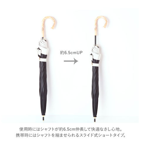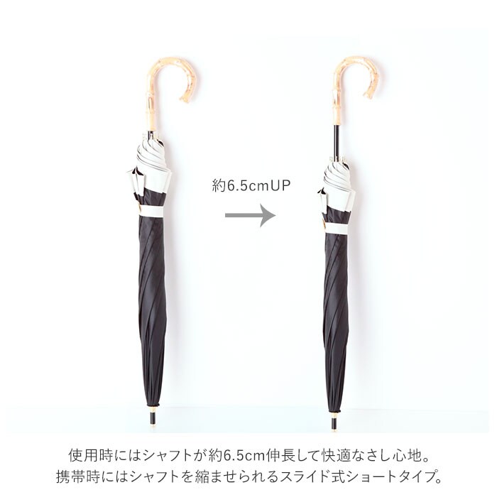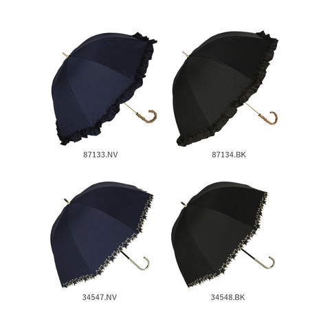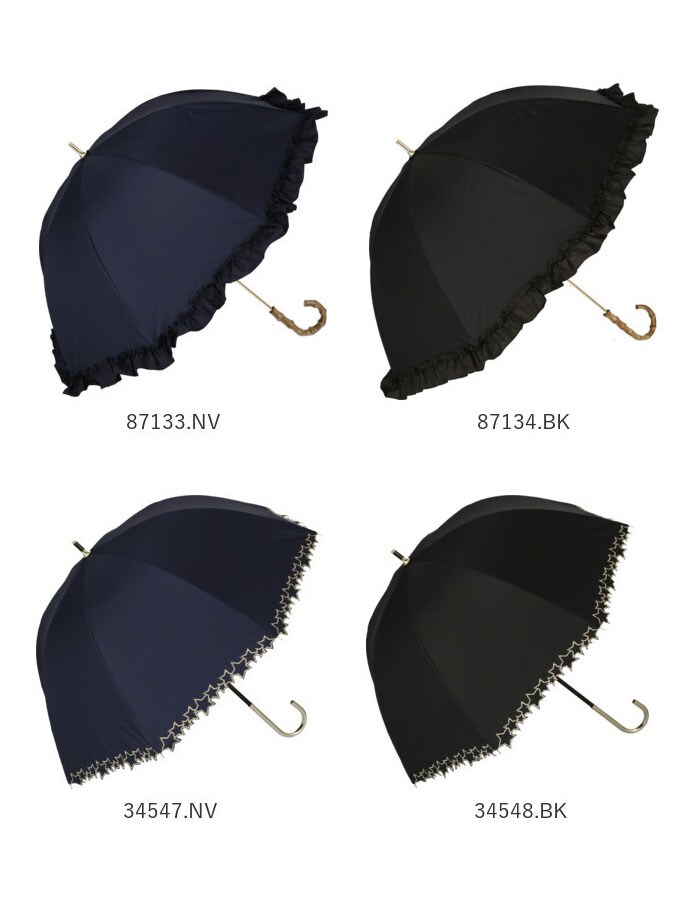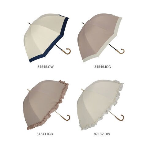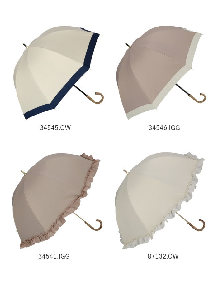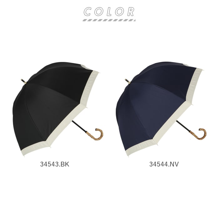 | 素材 | [傘生地の組成] 表:ポリエステル100% 裏:ポリウレタン100% [親骨]グラスファイバー [中骨]アルミ [手元ハンドル]バンブー (※手元ハンドルは、34547.NV・34548BKのみアルミ素材となります。) |