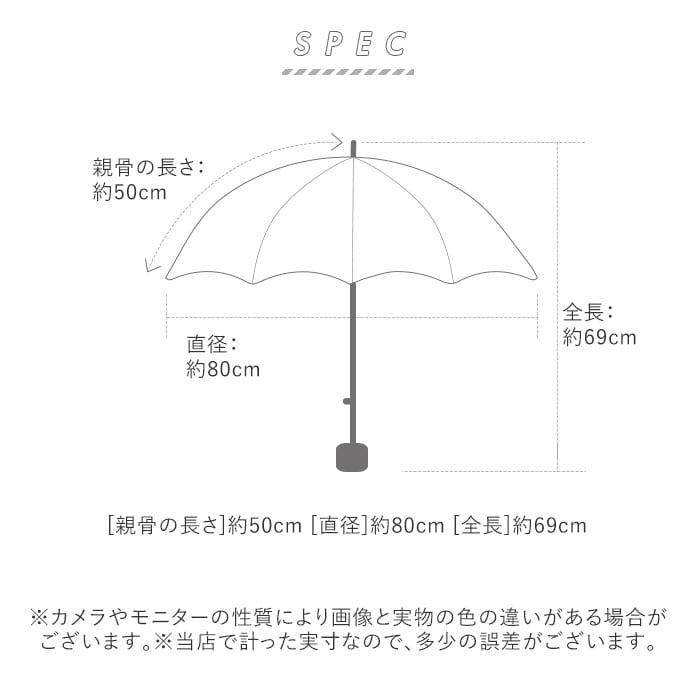 | サイズ | [親骨の長さ]約50cm [直径]約80cm [全長]約69cm ※サイズは当店平置き実寸サイズです。実際の商品とは多少の誤差が生じる場合がございます。あらかじめご了承ください。 |