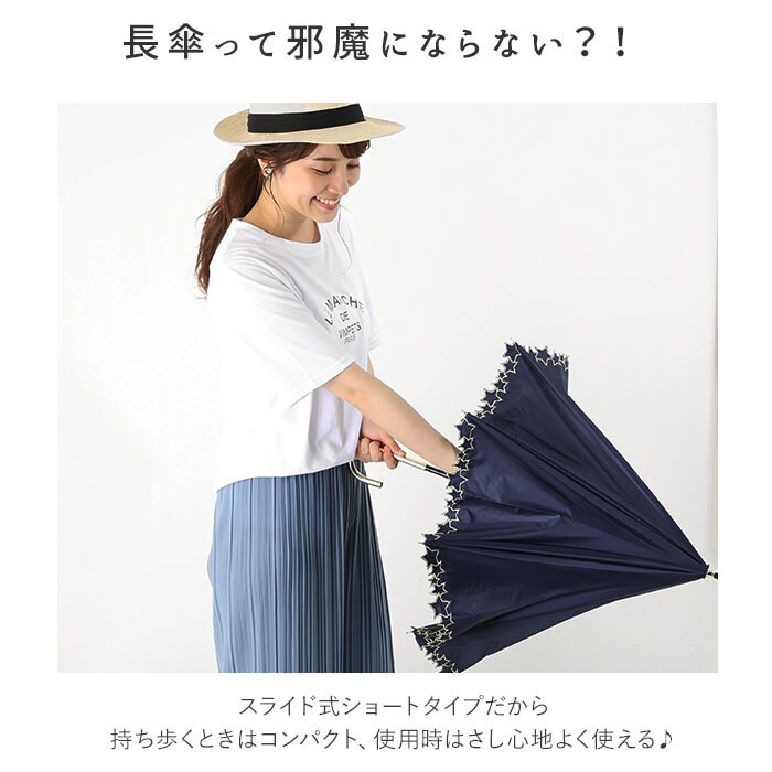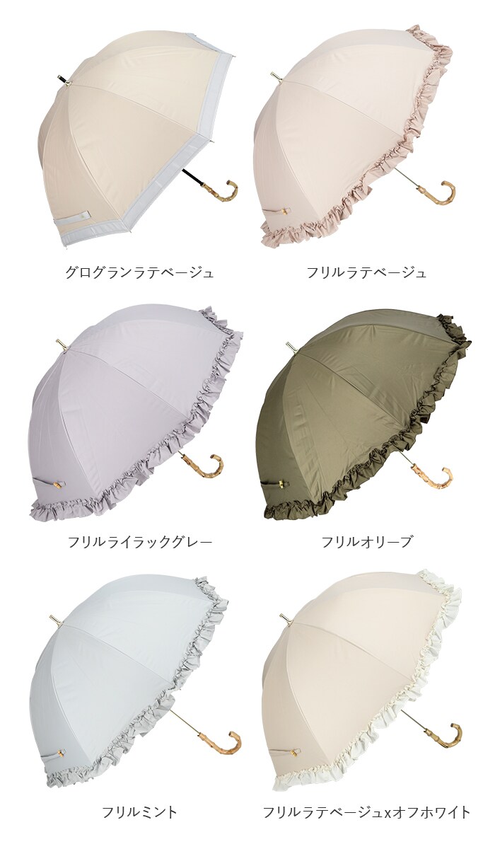 | 商品説明 | ふんわり丸みを帯びたシルエットが印象的な深張りタイプ!pinktrick(ピンクトリック)の晴雨兼用深張り長傘。親骨には軽くて丈夫なグラスファイバー骨を使用。しなやかな弾力性で強い風の日でも安心。傘生地の内側にはブラックコーティングを施し、紫外線はもちろん、地面からの照り返しも吸収し、赤外線や可視光線もカット!遮熱効果ばっちりの遮光率100%で、涼しくて、眩しくない!傘を差さずにいるときに比べ、体感温度がおよそマイナス15度。(※使用されている生地が、JIS規格 JIS L 1055 A法により遮光率100%のものを”完全遮光100”としております。)開閉時に爪や指を挟むのを防止するネイルガード付きで、ネイルアートを施した指でも安全に開閉できる。傘を使用時にはシャフトが約6.5cm伸長して快適なさし心地。携帯時にはシャフトを縮ませることにより、コンパクトに持ち運べるスライド式ショートタイプ。傘生地にははっ水加工を施し、日傘としてだけでなく、雨傘としても使用可能な晴雨兼用傘。突然の通り雨でも慌てない!傘生地に可憐なフリルをあしらった「FRILL(フリル)シリーズ」([34541.IGG][87132.OW][87133.NV][87134.BK])、光沢感のあるテープ生地で縁取った「GROSGRAIN(グログラン)シリーズ」([34543.BK][34544.NV][34545.OW][34546.IGG])、星型ゴールドの刺繍がキュートな「TWINKLE STAR(トゥインクルスター)シリーズ」([34547.NV][34548.BK])の3種類のシリーズからお気に入りがチョイスできる♪傘骨のシャフトはエレガントなゴールドカラー。持ち手ハンドルのバンブー素材(※)もナチュラルで女性らしい雰囲気。(※トゥインクルスターシリーズ[34547.NV][34548.BK]のみ、ゴールドカラーのアルミ製ハンドルを採用しています。) |