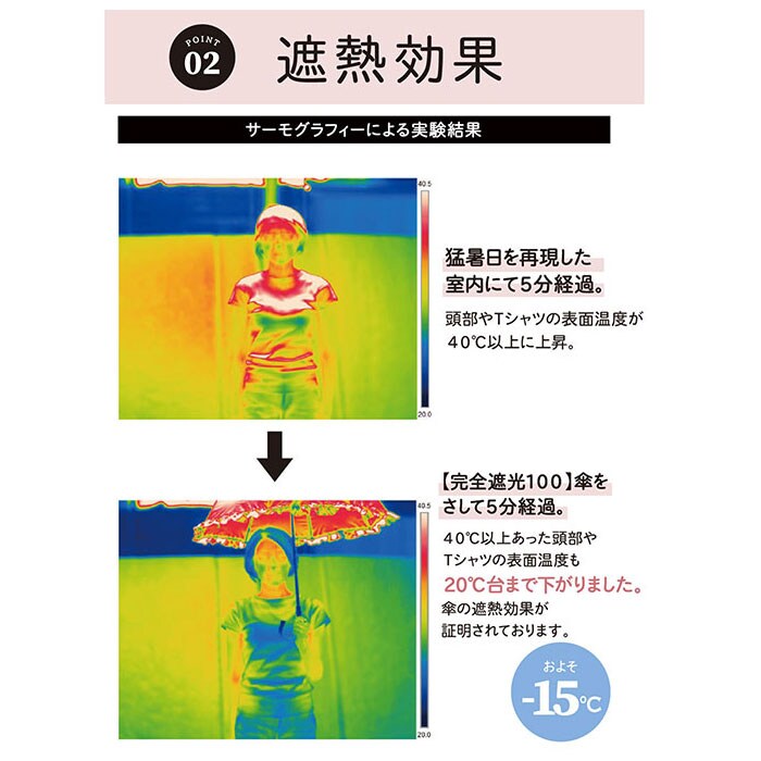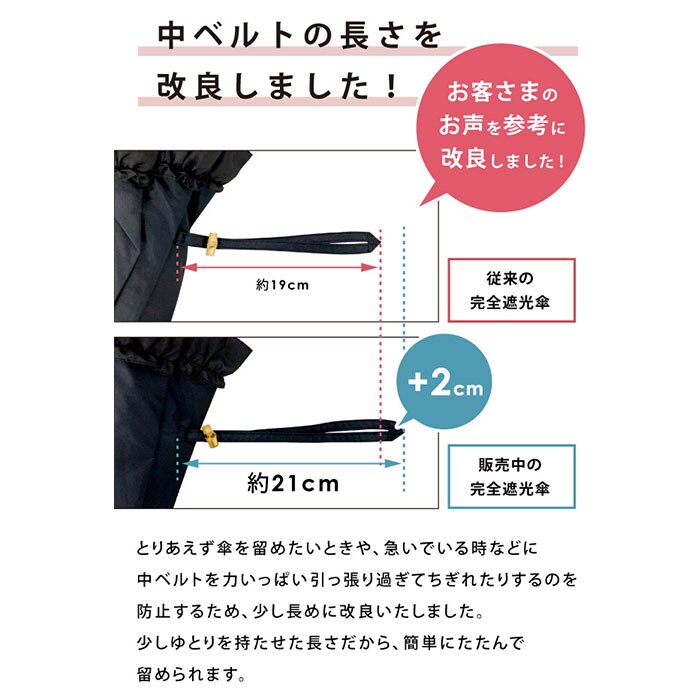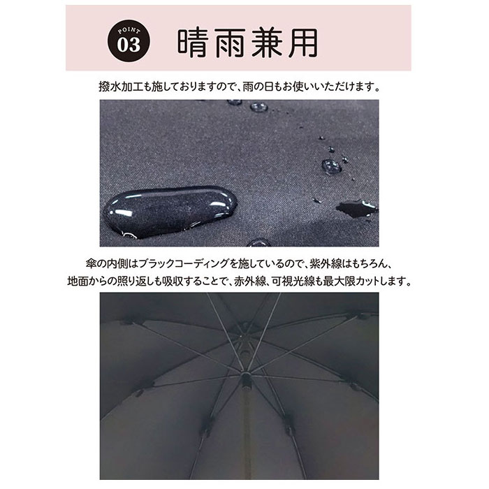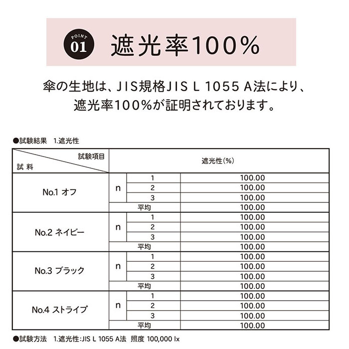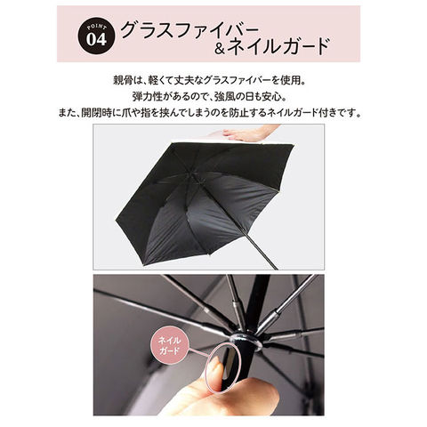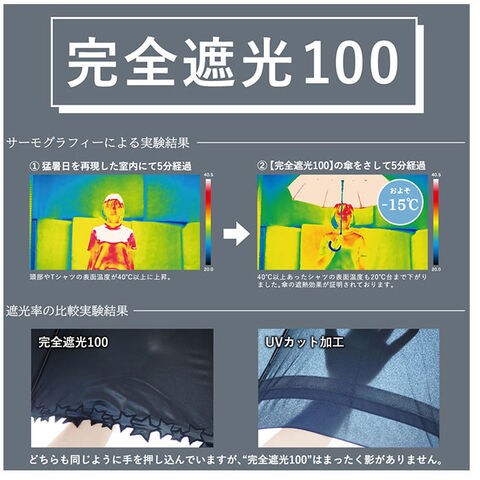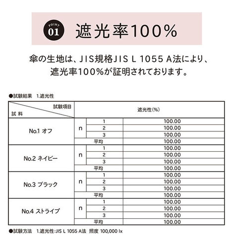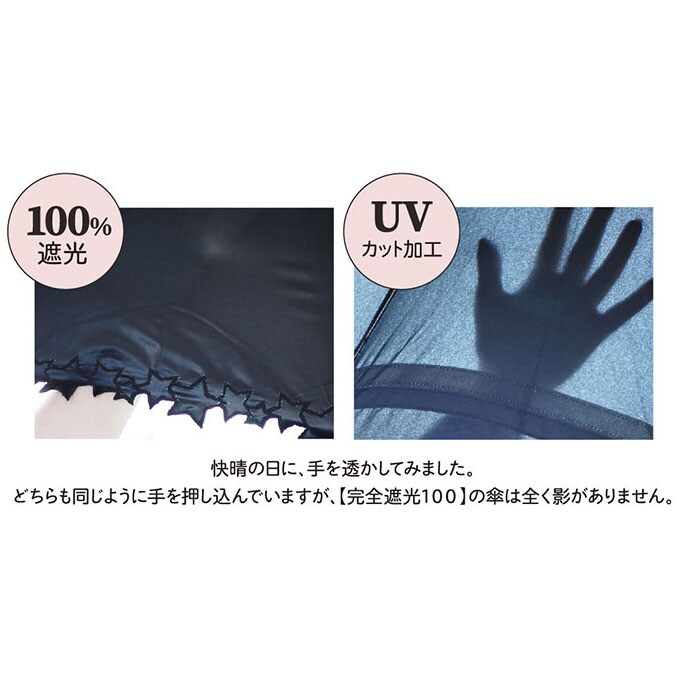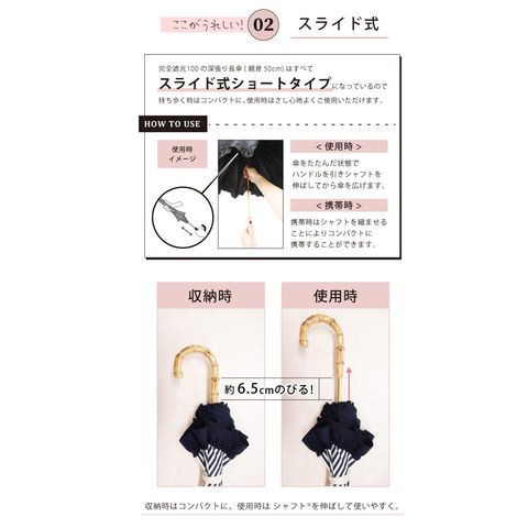 | 注意点 | 使用されている生地がJIS規格JIS L 1055 A法により遮光率100%のものを"100%完全遮光"としております。(フリル・縫製・加工部分はその限りではありません。体感温度はご使用環境や個人差により異なります。)裏地加工への強い摩擦や衝撃は剥離につながる恐れがあります。開閉やスライドの際は軽くさばいてからゆっくりと斜め下向きに丁寧にお取り扱いください。(上向きや急速な開閉は接続部に負荷がかかり、早期破損の可能性が高くなります。)閉じた際は、都度紐でまとめてください。開閉の際、やや固い感じやたたみ難さがありますが、生地の特性としてご理解ください。傘には耐久性として若干のあそび部分を持たせています。グラつきと勘違いされることがありますが、これにより破損や伸縮不能を回避します。製品には尖った部分があります。傘の開閉時には顔や身体から離して周囲の安全を十分に確認の上ご使用ください。手元、骨の先端が壊れたまま使用しないでください。強風時は危険ですので使用しないで下さい。ご使用後は陰干しして十分に乾燥させてから次回お使いください。(ご使用後、濡れたまま放置すると防水はっ水力の低下や骨の劣化につながります。)直射日光・高温多湿での保管や放置は退色する場合がありますので避けてください。カメラやモニターの性質により、画像と実物の色の違いがある場合がございますのでご理解願います。 |