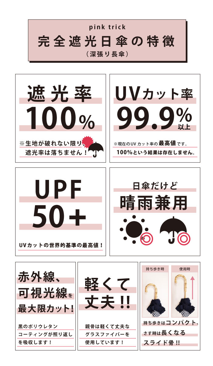 | 商品説明 | ふんわり丸みを帯びたシルエットが印象的な深張りタイプ!pinktrick(ピンクトリック)の晴雨兼用深張り長傘。親骨には軽くて丈夫なグラスファイバー骨を使用。しなやかな弾力性で強い風の日でも安心。傘生地の内側にはブラックコーティングを施し、紫外線はもちろん、地面からの照り返しも吸収し、赤外線や可視光線もカット!遮熱効果ばっちりの遮光率100%で、涼しくて、眩しくない!傘を差さずにいるときに比べ、体感温度がおよそマイナス15度。(※使用されている生地が、JIS規格 JIS L 1055 A法により遮光率100%のものを”完全遮光100”としております。)開閉時に爪や指を挟むのを防止するネイルガード付きで、ネイルアートを施した指でも安全に開閉できる。傘を使用時にはシャフトが約6.5cm伸長して快適なさし心地。携帯時にはシャフトを縮ませることにより、コンパクトに持ち運べるスライド式ショートタイプ。傘生地にははっ水加工を施し、日傘としてだけでなく、雨傘としても使用可能な晴雨兼用傘。突然の通り雨でも慌てない!爽やかなストライプ柄を可憐なフリルで縁取ったエレガントなデザイン。持ち手ハンドルのバンブー素材がナチュラルで女性らしい雰囲気。 |