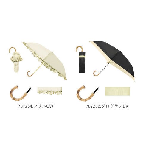 | 素材 | [傘生地の組成] 表:ポリエステル100% 裏:ポリウレタン(ポリウレタン樹脂コーティング) [親骨]グラスファイバー [中骨]アルミ [手元ハンドル]バンブー |