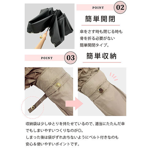 | 商品説明 | 傘骨を手で折らずに簡単開閉!pinktrick(ピンクトリック)の晴雨兼用・折りたたみ傘。親骨50cmタイプ。折りたたみ傘特有の角張ったシルエットではなく、まるくて可愛いシルエット♪持ち手ハンドルのバンブー素材もナチュラルで女性らしい雰囲気を演出。親骨には軽くて丈夫なグラスファイバー骨を使用。しなやかな弾力性で強い風の日でも安心。傘生地の内側にはブラックコーティングを施し、紫外線はもちろん、地面からの照り返しも吸収し、赤外線や可視光線もカット!遮熱効果ばっちりの遮光率100%で、涼しくて、眩しくない!傘を差さずにいるときに比べ、体感温度がおよそマイナス15度。(※使用されている生地が、JIS規格 JIS L 1055 A法により遮光率100%のものを「完全遮光100」としております。また、体感温度はご使用環境や個人差により異なります。)傘骨をポキポキと折らずに簡単開閉できる手開きタイプ。開閉時に爪や指を挟むのを防止するネイルガード付きで、ネイルアートを施した指でも安全に開閉できる。傘生地にははっ水加工を施し、日傘としてだけでなく、雨傘としても使用可能な晴雨兼用傘。突然の通り雨でも慌てない!付属の収納袋は、余裕を持たせたつくりなので、ルーズにたたんだ傘も収納しやすい。(※フリルシリーズのみ、傘袋の形状が異なります。)日傘を差すことで、自然と周りとの距離を保つことが可能。マスク焼けや熱中症対策としても、1本持っていたいアイテム。 |