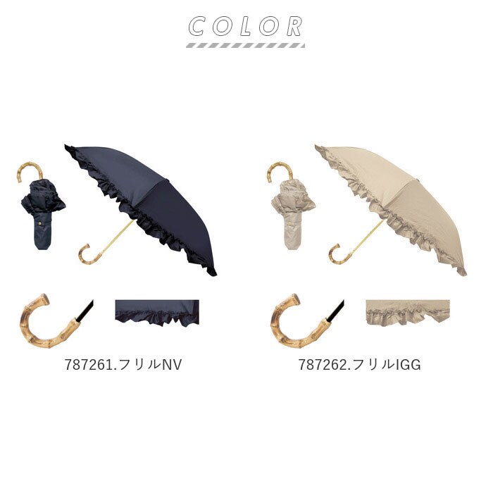| 素材 | [傘生地の組成] 表:ポリエステル100% 裏:ポリウレタン(ポリウレタン樹脂コーティング) [親骨]グラスファイバー [中骨]アルミ [手元ハンドル]バンブー |