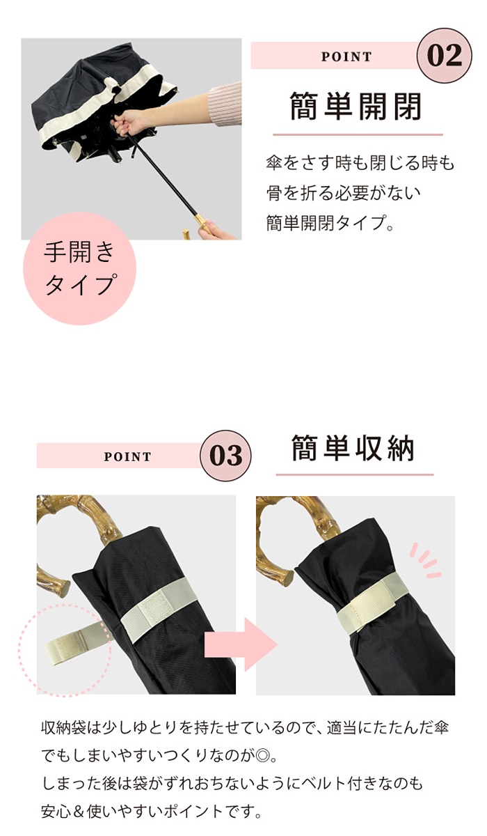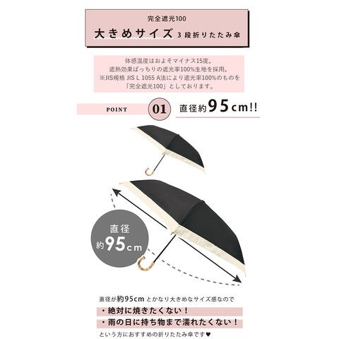 | 商品説明 | 「日射しからばっちり肌を守りたいあなたに!」pinktrick(ピンクトリック)の完全遮光折りたたみ傘に、親骨55cmタイプが新登場!傘生地の内側はブラックコーティング仕様。紫外線はもちろん、地面からの照り返しも吸収し、赤外線や可視光線もカット!涼しくて、眩しくない!傘を差さずにいるときに比べ、体感温度はおよそマイナス15度。遮熱効果ばっちりの遮光率100%生地を採用。(※JIS規格 JIS L 1055 A法により遮光率100%のものを「完全遮光100」としております。)日傘としてだけでなく、雨傘としても活躍する晴雨兼用傘!直径約95cmの大判サイズにしっかりはっ水加工生地で、突然の雨でも慌てない!傘骨をポキポキと折らずに簡単開閉が可能な手開きタイプ。爪や指を挟むのを防止するネイルガード付きで、ネイルアートを施した指でも安全!付属の収納袋は、余裕を持たせたつくりなので、ルーズにたたんだ傘もラクラク収納♪バンブー素材のナチュラルな持ち手や、ゴールドカラーのつゆ先がさりげなくおしゃれなデザイン。雨の日も日射しの強い日も素敵でいたい大人女子にオススメ。 |