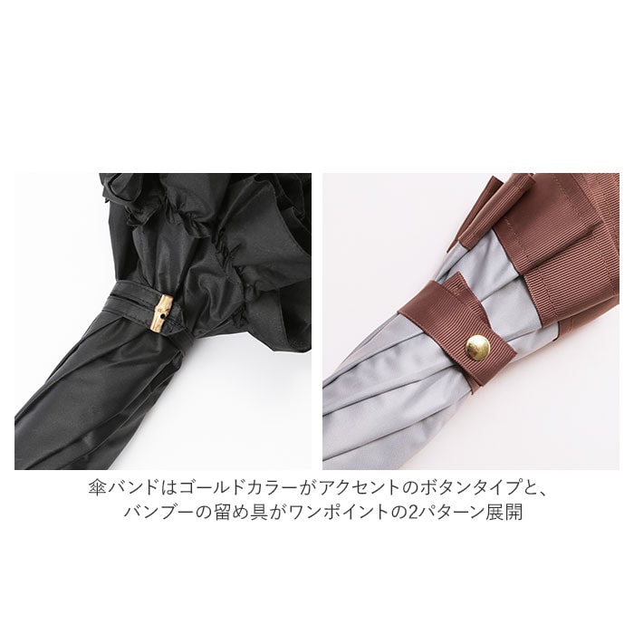 | 商品説明 | pink trick(ピンクトリック)より、深張りのまるいシルエットが可愛い晴雨兼用傘が発売。(親骨55cm)傘の裏生地に施されたブラックコーティングが紫外線はもちろん、赤外線、可視光線を最大限カット。さらに遮光率100%で遮熱効果もあるから涼しい、眩しくないを実現してくれる。(体感温度には個人差があります)親骨には軽くて丈夫なグラスファイバー骨を使用。弾力性があるから少し風の強い日も折れにくくて安心。傘は手開きタイプで、開閉時に指や爪を挟むのを防止するはじきカバー付き。持ち手はおしゃれなバンブー素材のハンドルを採用。(※カラーにより、傘生地裾のデザインとハンドルの色が異なります)傘バンドはゴールドカラーがアクセントのボタンタイプと、バンブーの留め具がワンポイントの2パターン展開。 |