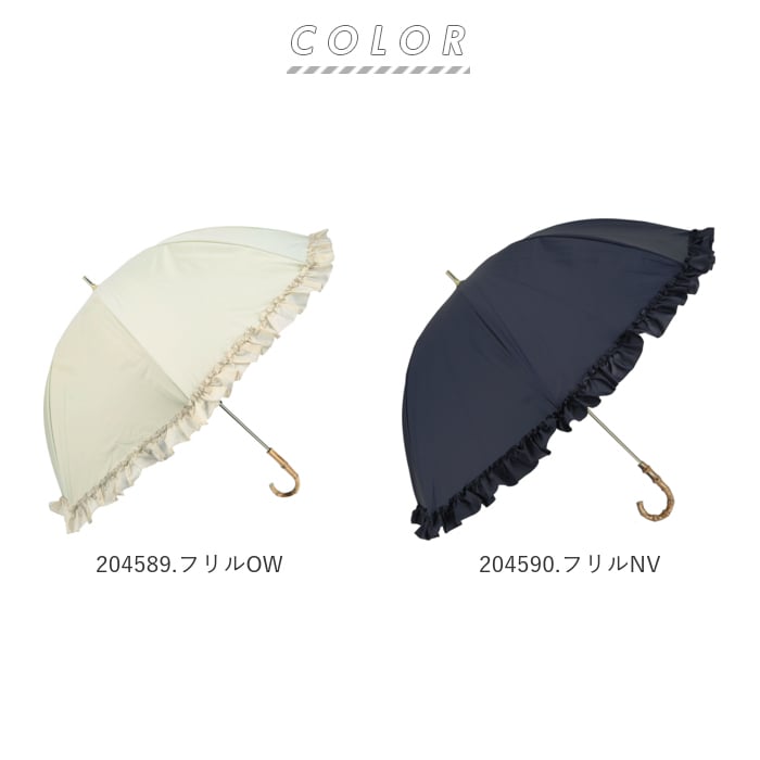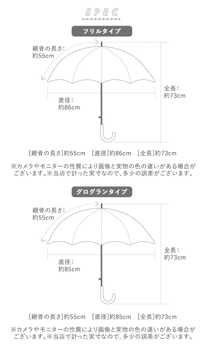 | サイズ | 【フリルタイプ】 [親骨の長さ]約55cm/[直径]約86cm/[全長]約73cm 【グログランタイプ】 [親骨の長さ]約55cm/[直径]約85cm/[全長]約73cm ※サイズは当店計測の実寸サイズです。実際の商品ならびにメーカー表記サイズとは多少の誤差が生じる場合がございます。あらかじめご了承ください。 |