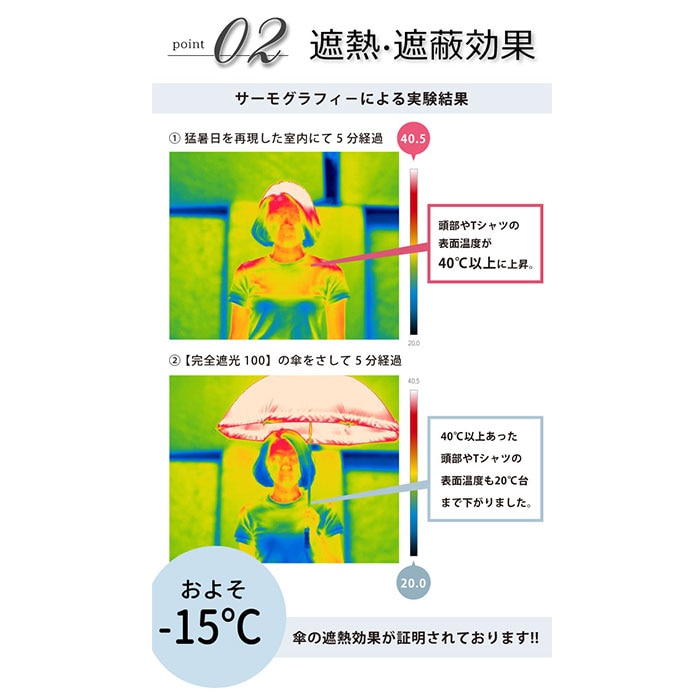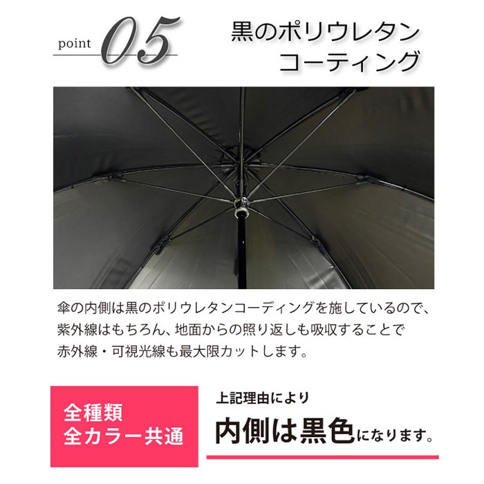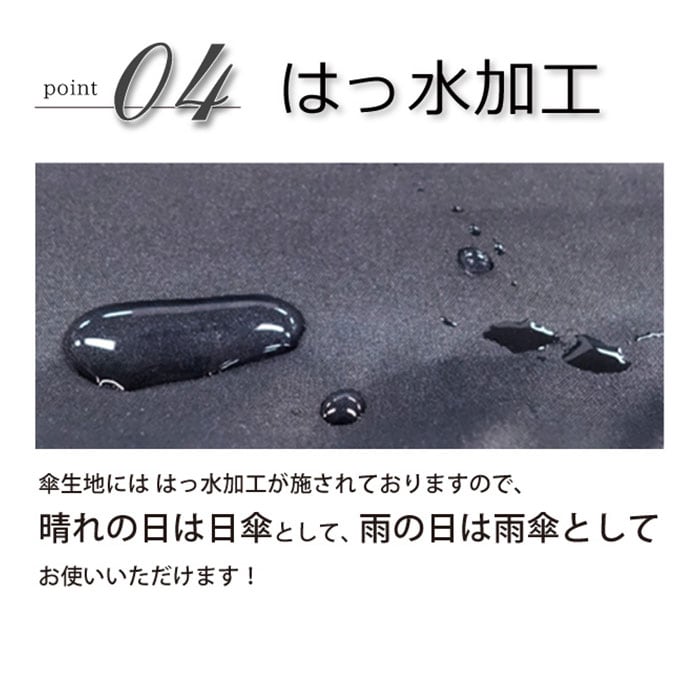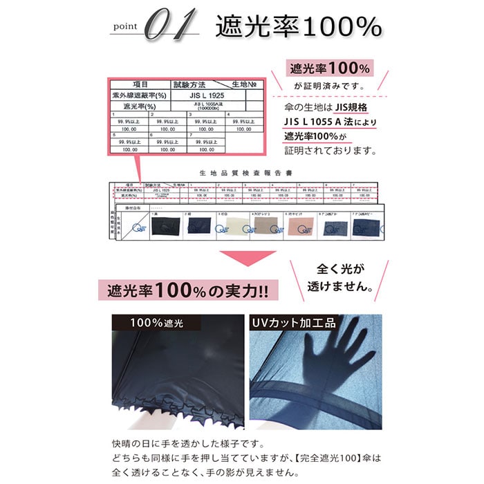 | 注意点 | 使用されている生地がJIS規格JIS L 1055A法により遮光率100%のものを「100%完全遮光」としております。(フリル・縫製・加工部分はその限りではありません。体感温度はご使用環境や個人差により異なります。)裏地加工への強い摩擦や衝撃は剥離につながる恐れがあります。開閉やスライドの際は軽くさばいてからゆっくりと斜め下向きに丁寧にお取り扱いください。(上向きや急速な開閉は接続部に負荷がかかり、早期破損の可能性が高くなります。)閉じた際は、都度紐でまとめてください。開閉の際、やや固い感じやたたみ難さがありますが、生地の特性としてご理解ください。傘には耐久性として若干のあそび部分を持たせています。グラつきと勘違いされることがありますが、これにより破損や伸縮不能を回避します。製品には尖った部分があります。傘の開閉時には顔や身体から離して周囲の安全を十分に確認の上ご使用ください。ステッキがわりに使用しないでください。手元、骨の先端が壊れたまま使用しないでください。強風時は危険ですので使用しないでください。振り回したり、投げたりしないでください。ご使用後は陰干しして十分に乾燥させてから次回お使いください。(ご使用後、濡れたまま放置すると防水撥水力の低下や骨の劣化につながります。)直射日光・高温多湿での保管や放置は退色する場合がありますので避けてください。カメラやモニターの性質により、画像と実物の色の違いがある場合がございますのでご理解願います。 |