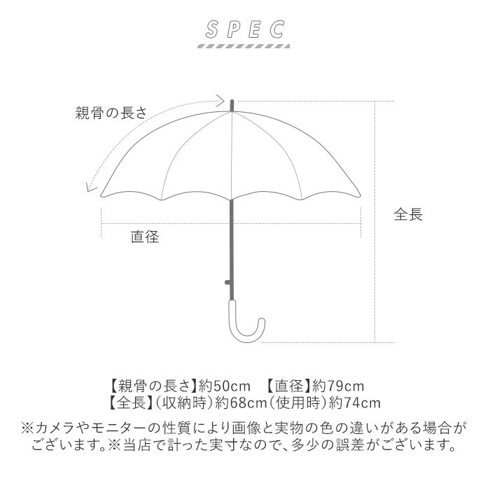 | サイズ | [親骨の長さ]約50cm/[直径]約79cm [全長(収納時)]約68cm/[全長(使用時)]約74cm ※サイズは当店計測の実寸サイズです。実際の商品ならびにメーカー表記サイズとは多少の誤差が生じる場合がございます。あらかじめご了承ください。 |