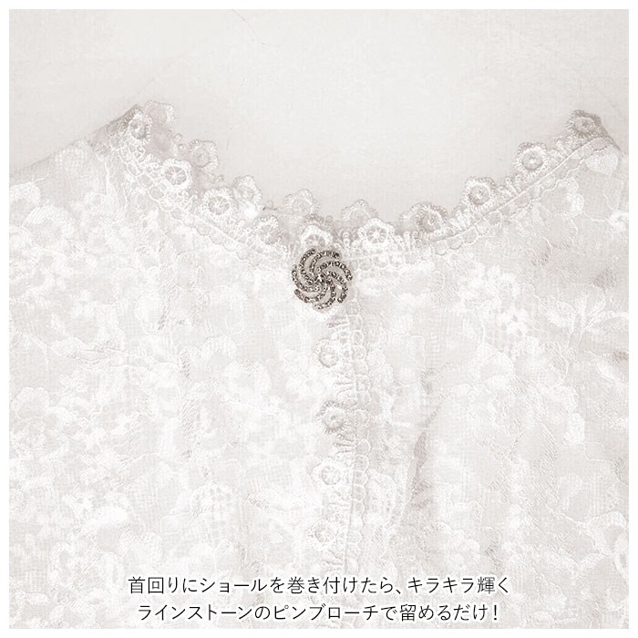 | 商品説明 | 晴れの日の衣装に、清楚な華やかさをプラス♪天使のように優しく身に纏える「キッズショール」繊細に編み込まれたレース生地を、立体感のある小花の刺繍で縁取った、気品漂うドレスショール。程よい透け感のある生地がふんわり肩を包み込んで、ドレスが持つ本来の魅力を引き立てる!首回りにショールを巻き付けたら、キラキラ輝くラインストーンのピンブローチで留めるだけ!ピアノの発表会やセレモニーの席では、無垢な純白のショールでプリンセスに変身♪ |