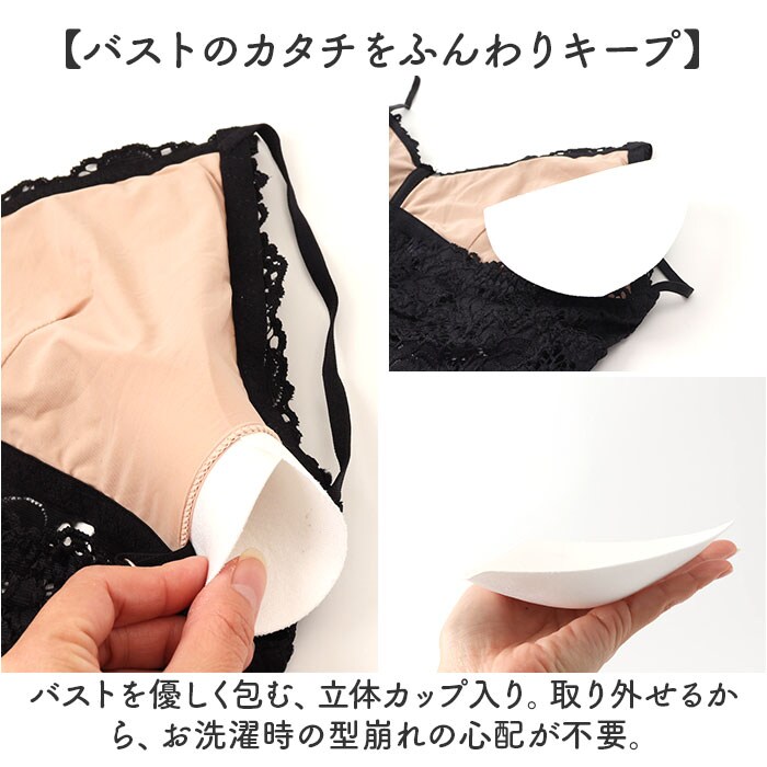 | 商品説明 | 【ヘルシーな肌魅せが叶うアイテム】おしゃれの強い味方♪素肌をキレイに魅せて、バストも支える「カップ付きキャミソール」。【コーデの幅が広がる万能インナー】透け感のあるトップスや羽織りに仕込むだけで、インナー見えせずおしゃれにキマる!【締め付け感がなくストレスフリー】締めつけ感が苦手な方に嬉しい、ノンワイヤー仕様。ストレッチ性もあり、自分サイズにフィット。【バストのカタチをふんわりキープ】バストを優しく包む、立体カップ入り。取り外せるから、お洗濯時の型崩れの心配が不要。【V字ラインのキレイなシルエット】胸元はV字に切り込みを入れ、谷間を美しく演出。女性らしさもグッと引き立つ♪【ホックなどがなく着脱スムーズ】頭からすっぽり被るだけ。ホックが肌に当たるなどの不快感ゼロ&長さ調節できるストラップ付。【汗をかいてもサラっと感をキープ】通気性に優れたレース素材で、汗ばむ季節もムレにくい!いつでも快適な付け心地。【お腹見せコーデもお任せ♪】お腹が見える短め丈感。ハイウエストパンツなどとの相性も良く、トレンド感のあるスタイルに。 |