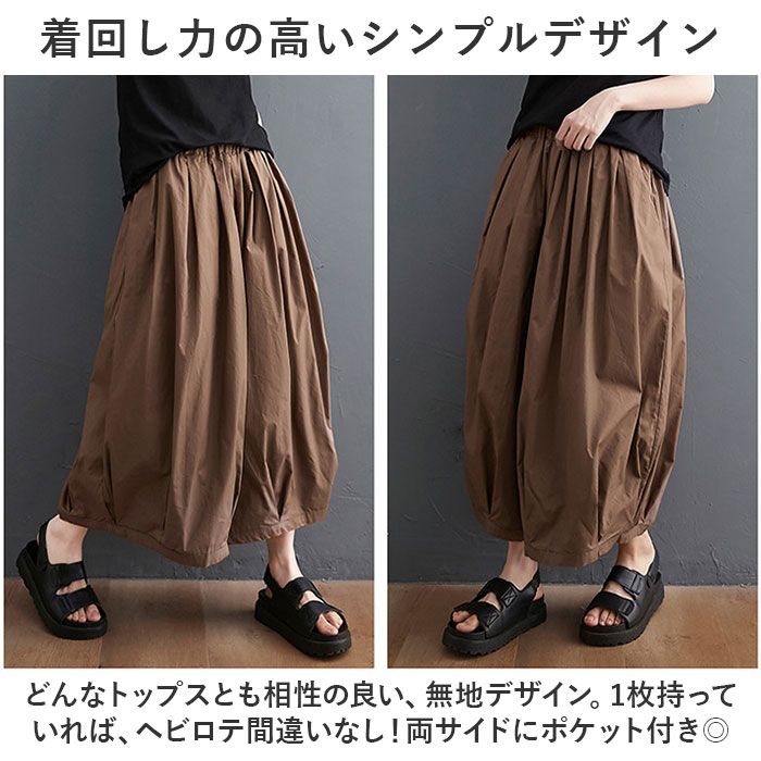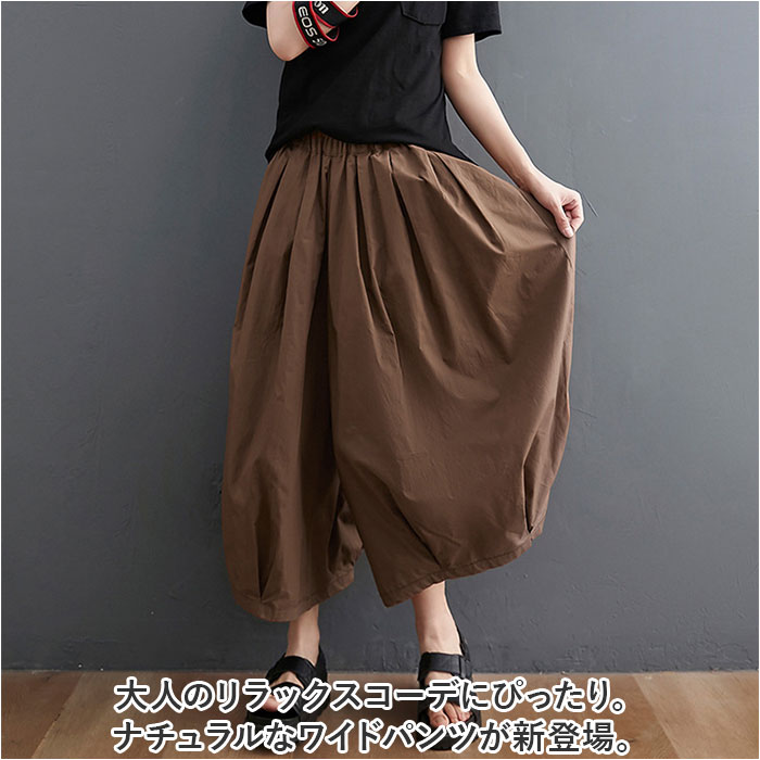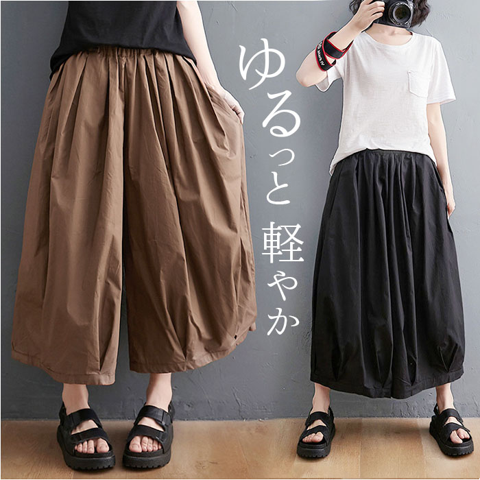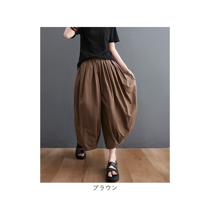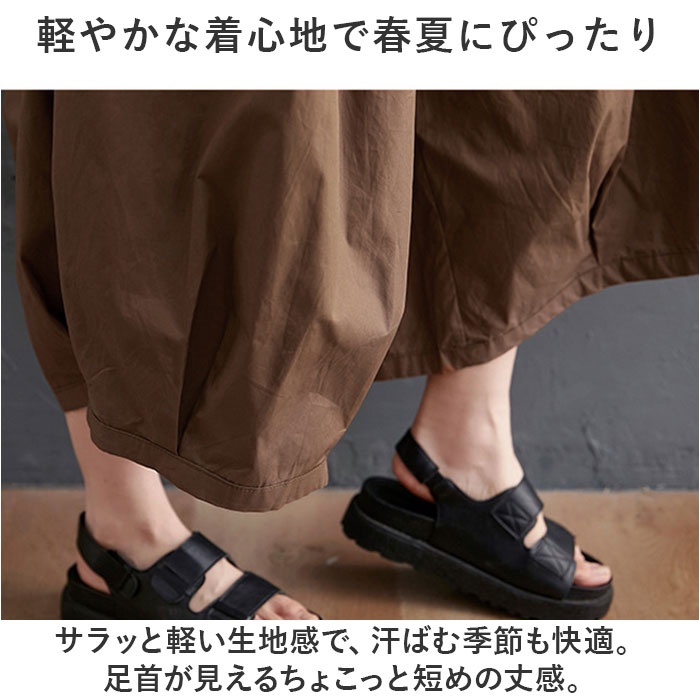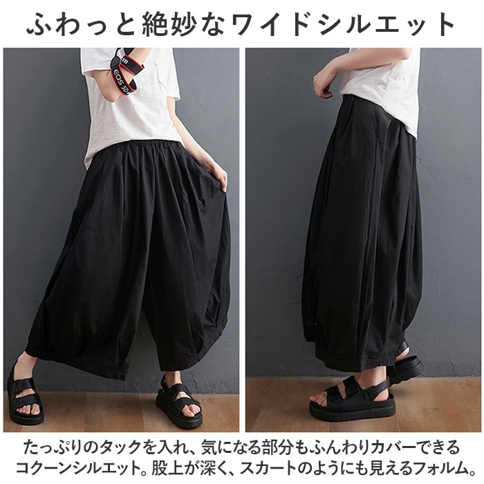 | 商品説明 | 大人のリラックスコーデにぴったり。ナチュラルなワイドパンツが新登場。【軽やかな着心地で春夏にぴったり】サラッと軽い生地感で、汗ばむ季節も快適。足首が見えるちょこっと短めの丈感。【ふわっと絶妙なワイドシルエット】たっぷりのタックを入れ、気になる部分もふんわりカバーできるコクーンシルエット。股上が深く、スカートのようにも見えるフォルム。【締め付け感がなくストレスフリー】自分サイズに優しくフィットし、着脱もスムーズなウエストゴム仕様。動きやすく、座りっぱなしでもラクチン!【着回し力の高いシンプルデザイン】どんなトップスとも相性の良い、無地デザイン。1枚持っていれば、ヘビロテ間違いなし!両サイドにポケット付き◎ |
