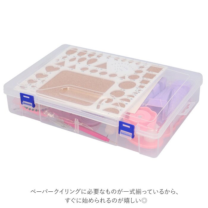 | 商品説明 | 美しいクイリングを作れる♪ペーパークイリングキットが登場。細長いペーパーをクルクル巻いてパーツを作り、組み合わせることで多様な作品が作れる!絵を描くのが苦手な方でも、作品作りができるアイテム。基本的なサークルの作り方はペーパーの端をスロットの溝に挟み、ペーパーを人差し指で押さえながらクルクルと巻く。巻き終わったらしっかり巻き締めてスロットを抜き、抜き取ったパーツはテンプレートボードのルーズサークルまたはタイトサークルに形を整え、ペーパーの端を接着剤で留めるだけ。ペーパーの色の使い方や巻き方次第で、カラフルなお花や動物、昆虫などが作れちゃう♪ペーパークイリングに必要なものが一式揃っているから、すぐに始められるのが嬉しい◎すべてのアイテムをまとめて収納できるボックス付き。・【セット内容】スロット・ピンセット・まち針セット・コーム・テンプレートボード・モールド・クリンパー・カーリングコーチ・ボーダーバディセット・空ボトル・絡み器・デザイン図案ボード、収納ボックス |