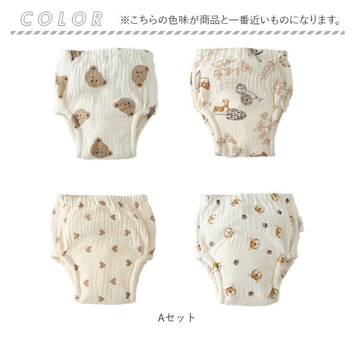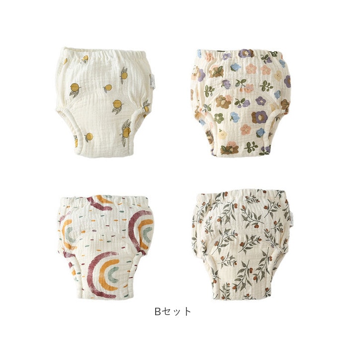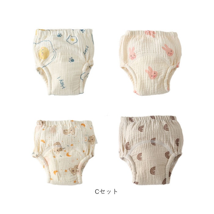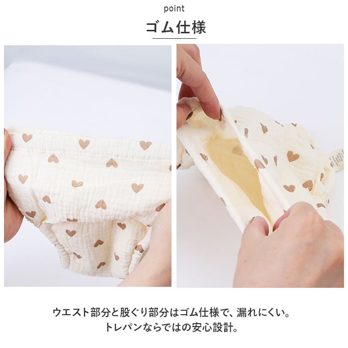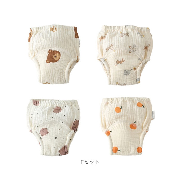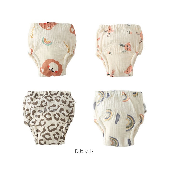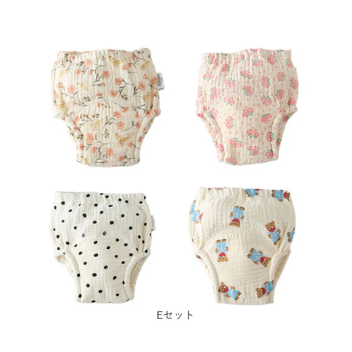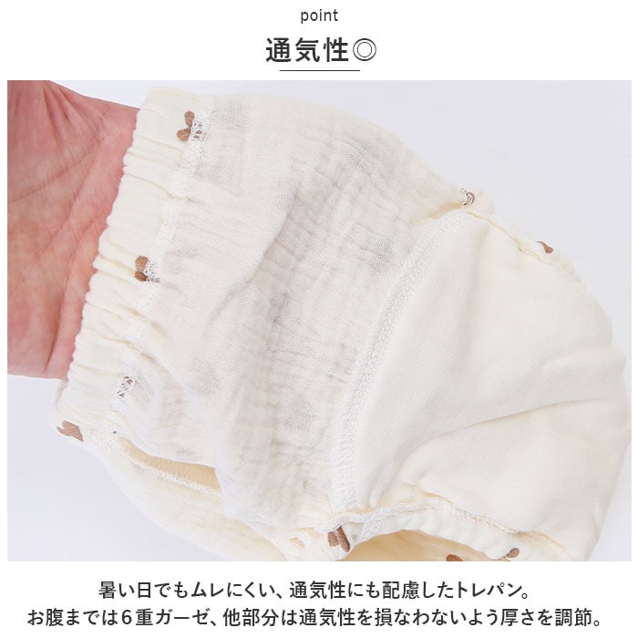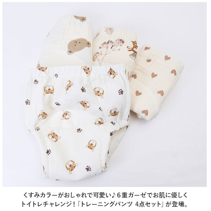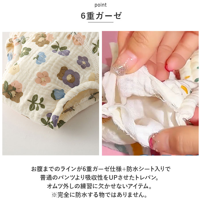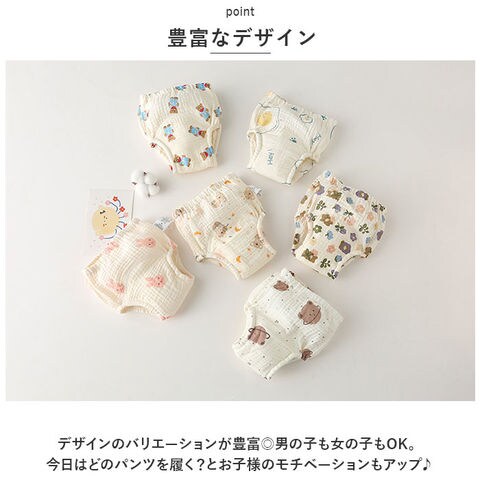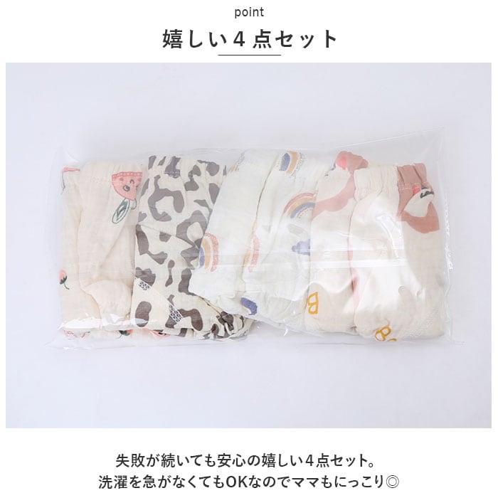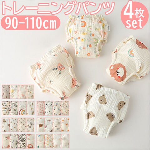 | 商品説明 | くすみカラーがおしゃれで可愛い♪6重ガーゼでお肌に優しくトイトレチャレンジ!「トレーニングパンツ 4点セット」が登場。【6重ガーゼ】お腹までのラインが6重ガーゼ仕様+防水シート入りで、普通のパンツより吸収性をUPさせたトレパン。オムツ外しの練習に欠かせないアイテム。※完全に防水する物ではありません。【天然素材】コットン使用の生地でお肌に優しい仕様。デリケートな部分に触れるものだから優しい天然素材で、柔らかタッチなのも嬉しいポイント。【通気性◎】暑い日でもムレにくい、通気性にも配慮したトレパン。お腹までは6重ガーゼ、他部分は通気性を損なわないよう厚さを調節。【ゴム仕様】ウエスト部分と股ぐり部分はゴム仕様で、漏れにくい。トレパンならではの安心設計。【嬉しい4点セット】失敗が続いても安心の嬉しい4点セット。洗濯を急がなくてもOKなのでママもにっこり◎【豊富なデザイン】デザインのバリエーションが豊富◎男の子も女の子もOK。今日はどのパンツを履く?とお子様のモチベーションもアップ♪ |
