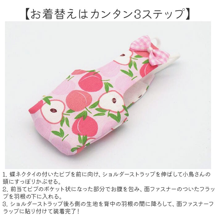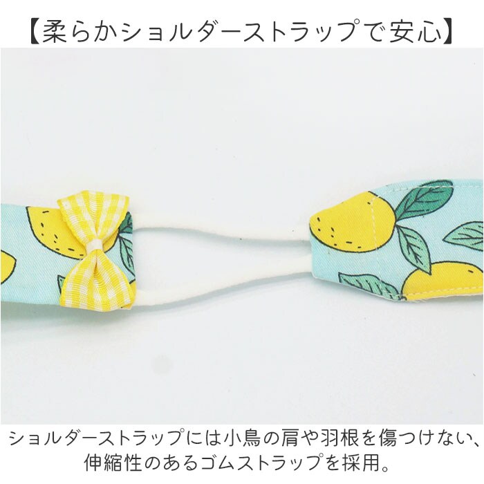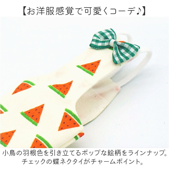 | 商品説明 | 【お部屋の中を自由に羽ばたける!】小鳥さんと過ごすおうち時間を、可愛らしく快適に♪着せ替え簡単「小鳥用 おむつ」が新登場!【室内の汚れを防いで、いつも清潔】柔らかな布地が小鳥さんのお腹周りを包みこみ、お漏らしをキャッチ!お部屋の汚れ気にならない♪【お着替えはカンタン3ステップ】1.蝶ネクタイの付いたビブを前に向け、ショルダーストラップを伸ばして小鳥さんの頭にすっぽりかぶせる。2.前当てビブのポケット状になった部分でお腹を包み、面ファスナーのついたフラップを羽根の下に入れる。3.ショルダーストラップ後ろ側の生地を背中の羽根の間に降ろして、面ファスナーフラップに貼り付けて装着完了!【柔らかショルダーストラップで安心】ショルダーストラップには小鳥の肩や羽根を傷つけない、伸縮性のあるゴムストラップを採用。【羽ばたきを邪魔しないつくり】羽根の動きを邪魔しないように生地を裁断。お部屋の中で自由に羽ばたける快適さを重視したつくり。【漏れを防いで、お手入れ簡単】前当てポケットにペーパータオルやコットンを入れてお漏らしを即座に吸収!こまめに交換が可能。【繰り返し使えて、とってもエコ】お手入れの楽な綿混紡素材なので、ご家庭で手軽にお洗濯OK!繰り返し使えて、いつでも清潔♪【お洋服感覚で可愛くコーデ♪】小鳥の羽根色を引き立てるポップな絵柄をラインナップ。チェックの蝶ネクタイがチャームポイント。【お出掛けはバードキャリーで】小鳥さんと一緒のお出掛けや動物病院への訪問は「ポータブル・バードキャリー」がオススメ!※「ポータブル・バードキャリー」は、別商品ページでご購入いただけます。ストアの検索窓に、商品コード「kpet35」を入力し、ご覧ください。 |